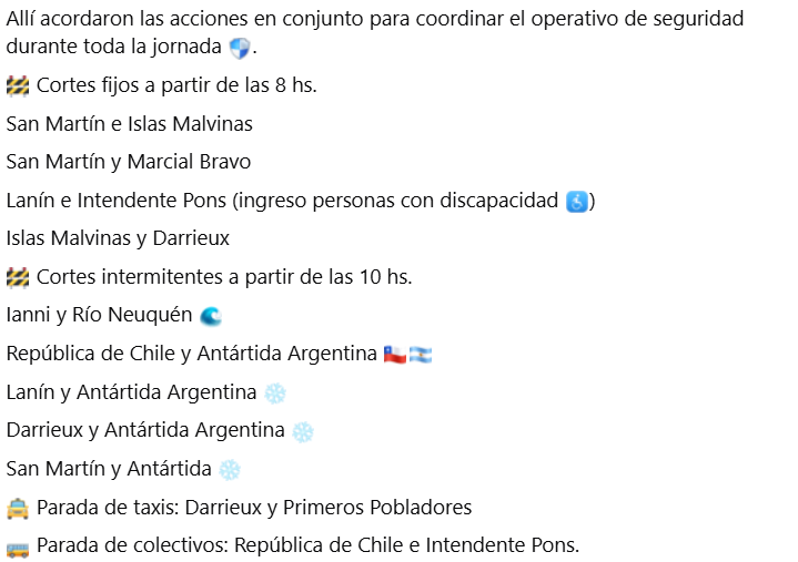 El municipio de Centenario mediante la secretaria de Gobierno, Rosalí Esteves, junto a la Cruz Roja filial Neuquén, a cargo de Juan Diego Lorente, Tránsito y Transporte, con el secretario Benito Torres, Policía de Comisaría Quinta, con la subcomisario Vanesa Navarrete, y de Tránsito Villa Obrera, con el subcomisario Damián Jorquera, y los grupos scouts, en una reunión definieron detalles del operativo que será implementado durante esa jornada.