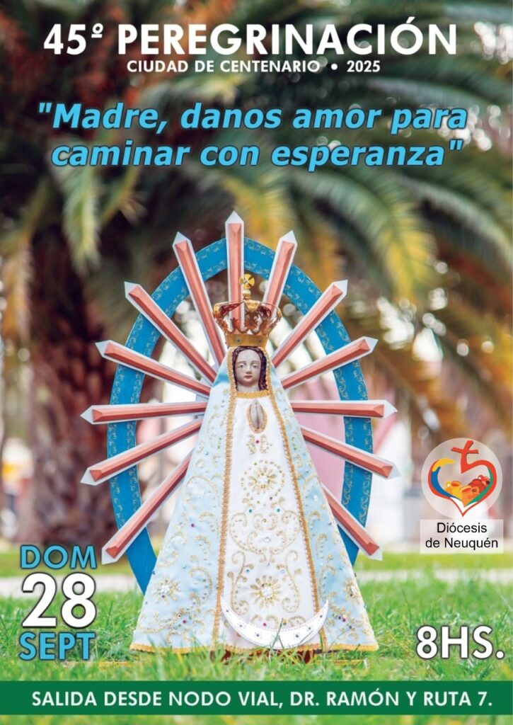 El domingo 28 de septiembre fieles de distintas ciudades de alto valle llegarán a Centenario para honrar a la Virgen de Luján, todos se concentrarán a las 12 frente a la iglesia ubicada sobre la calle San Martín, frente a la plaza central del Casco Viejo. Bajo el lema «Madre, danos amor para caminar con esperanza «, la Diócesis de Neuquén invita a participar de la 45ª Peregrinación a la Virgen de Luján.