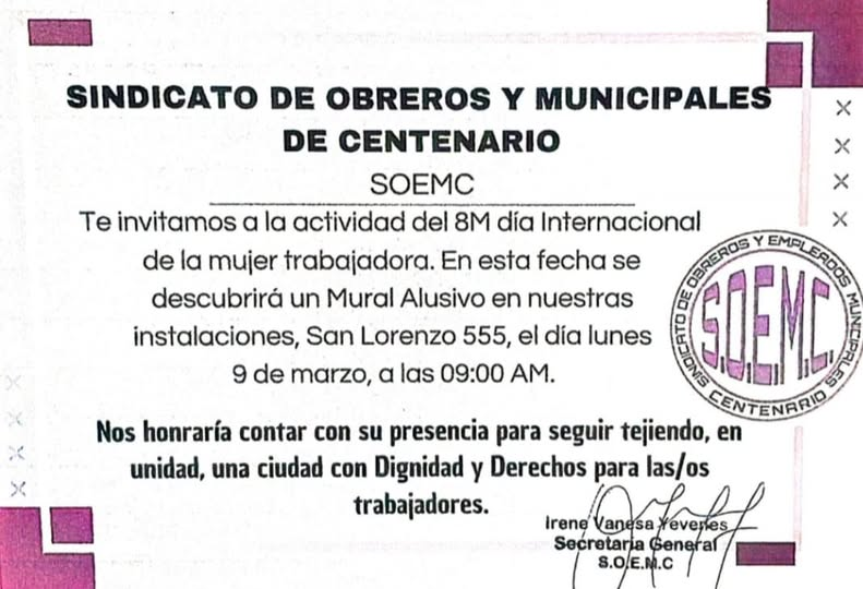 El Sindicato de Obreros y Empleados Municipales -SOEMC- informó que va a parar e invitar a la comunidad a participar de la realización de un mural alusivo en sus instalaciones de la calle San Lorenzo 555, el lunes a las 9 de la mañana.