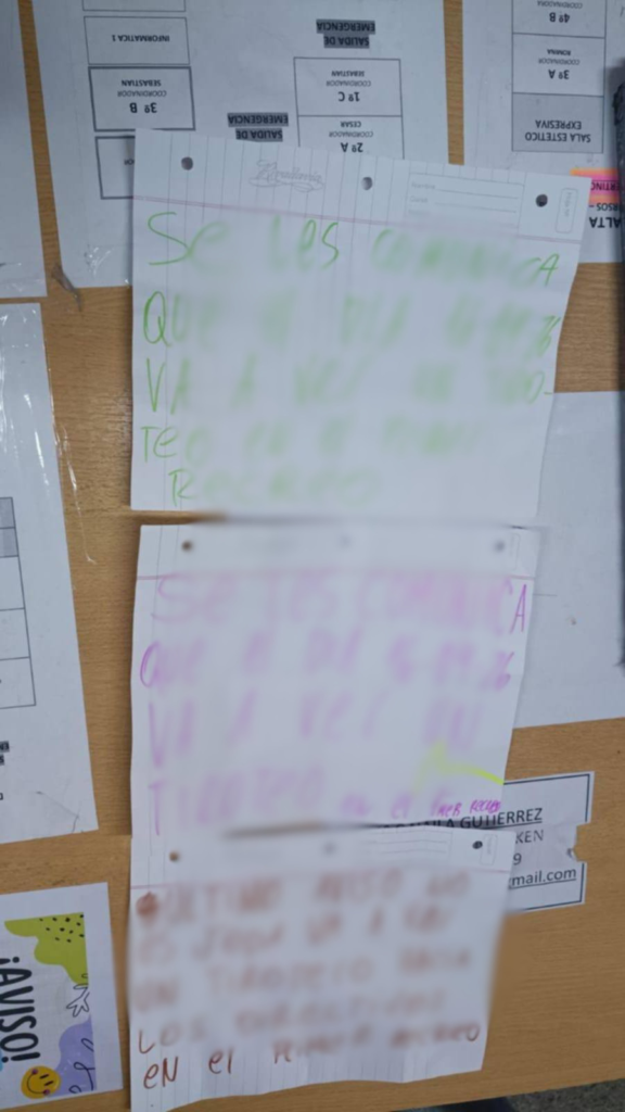 De acuerdo a lo que se supo, tres carteles con mensajes intimidantes fueron hallados en el establecimiento educativo. Uno se encontraba en la salida al patio y las amenazas eran dirigidas a directivos, otro en el baño de hombres de la planta baja y un tercero en el baño de mujeres. Indicaban con diferentes colores «Se les comunica que el día 16-04-26 va a haber un tiroteo en el primer recreo» y «no es joda va a haber un tiroteo hacia los directivos».