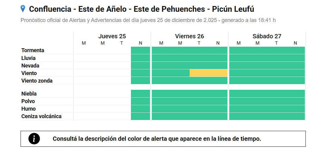 Para este viernes 26 de diciembre el Servicio Meteorológico Nacional emitió una alerta amarilla para las provincias de Neuquén y Río Negro por fuertes vientos. La misma rige para horas de la tarde y noche ya que las ráfagas podrían llegar a los 100 km/h en algunas zonas indica lo informado por el SMN.