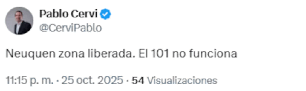 A través de su perfil en Twitter Cervi expresó su malestar por la falta de seguridad. De manera concisa expresó: “Neuquén zona liberada. El 101 no funciona”