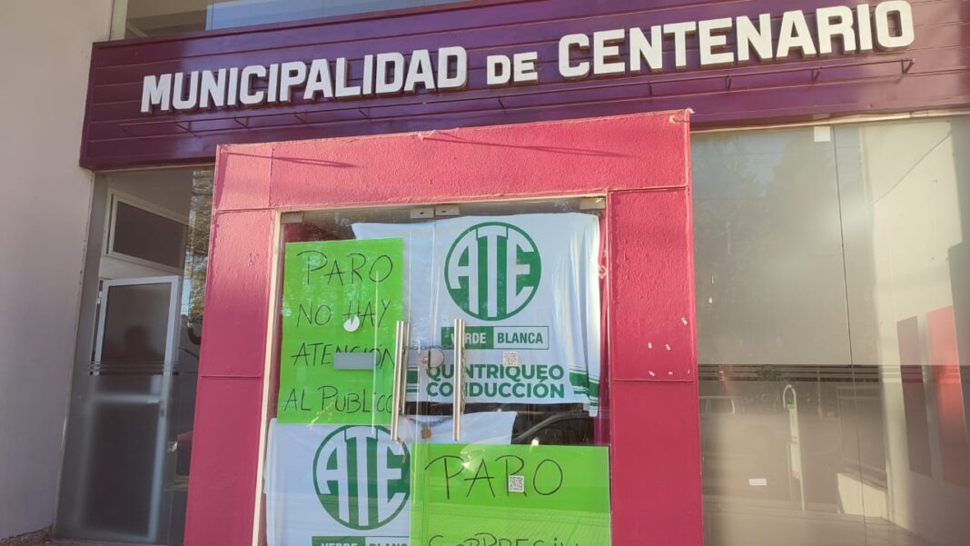 La Asociación de Trabajadores del Estado profundizó el paro en el municipio de Centenario. El jueves 16 las medidas alcanzaron el edificio central de las calles Intendente Pons y San Martín el cual permanece sin atención público y lo mismo el corralón de calle Luis Rozza.