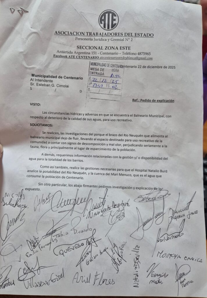 El lunes 22 por la mañana una movilización y concentración del gremio ATE sorprendió a los vecinos sobre la calle Intendente Pons, frente a la municipalidad de Centenario. Es que el sindicato fue a presentar notas dirigidas al intendente Esteban Cimolai en las cuales pide explicaciones por la situación del Balneario Municipal el cual tiene aún muy bajo caudal de agua.