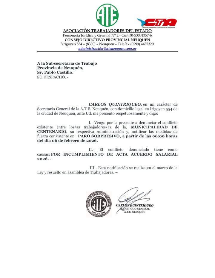 El gremio Ate convocó para este viernes 6 de febrero a partir de la hora 6 a un paro sorpresivo en el Municipio de Centenario.