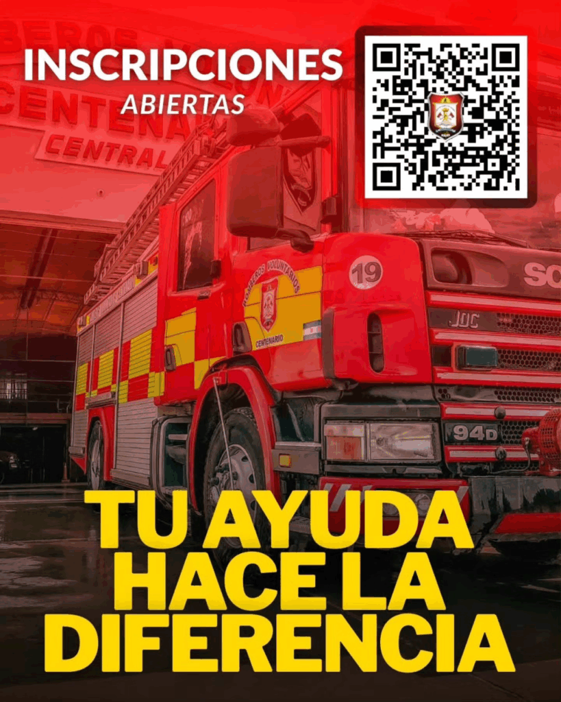 La Asociación Bomberos Voluntarios Centenario informó que se encuentran abiertas las inscripciones para aspirantes a integrar a futuro el cuerpo activo. Las mismas se pueden realizar mediante código QR y se extenderán hasta el próximo 25 de noviembre. La invitación a la comunidad a sumarse se centra en personas comprometidas, solidarias y con vocación de servicio, mayores de 18 años y hasta 45 por el seguro obligatorio, en buen estado de salud, es excluyente ser de Centenario y tener el secundario cursado o en trámite, disponibilidad para capacitación y guardias.