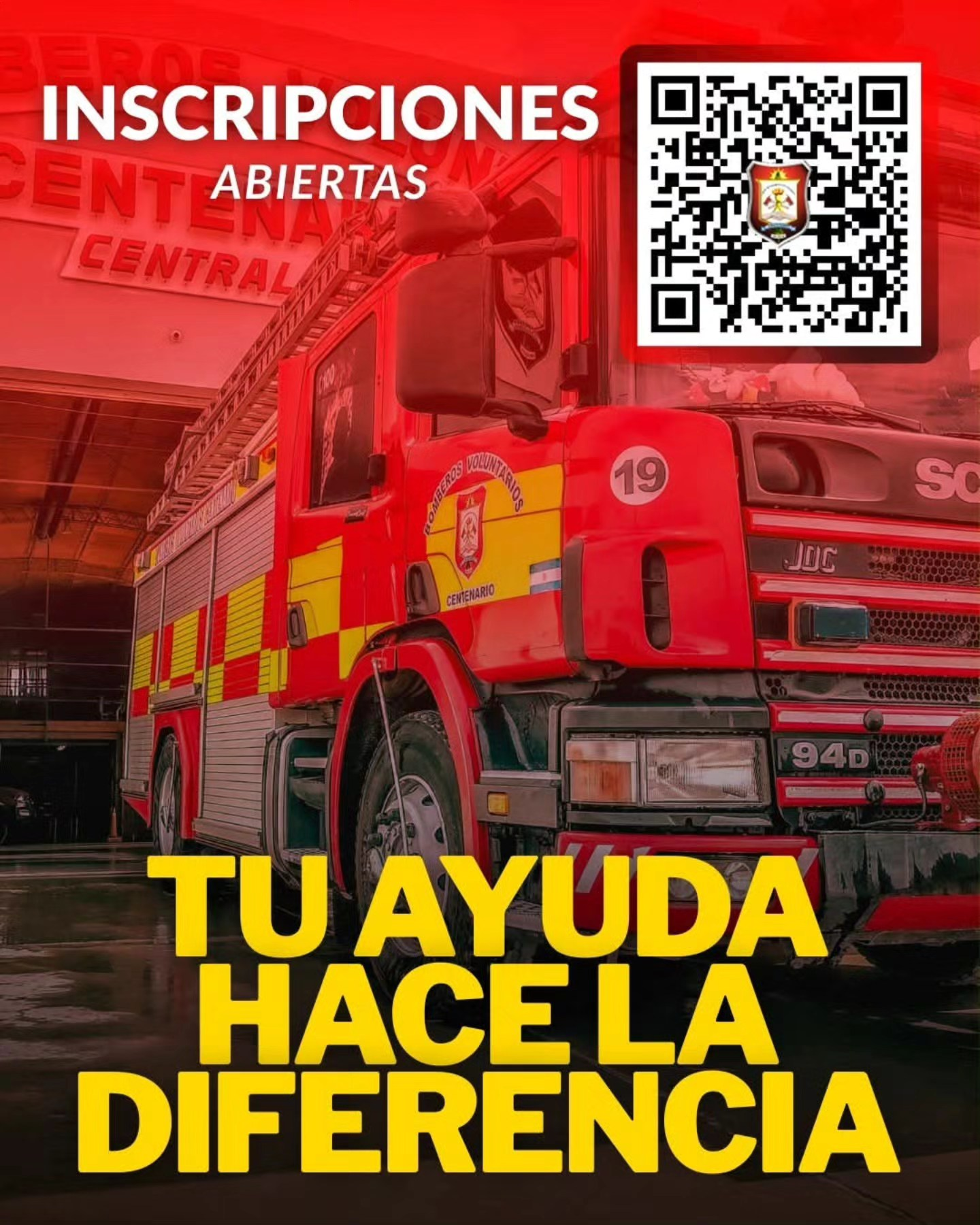 La Asociación Bomberos Voluntarios Centenario informó que se encuentran abiertas las inscripciones para aspirantes a integrar a futuro el cuerpo activo. Las mismas se pueden realizar mediante código QR y se extenderán hasta el próximo 25 de noviembre. La invitación a la comunidad a sumarse se centra en personas comprometidas, solidarias y con vocación de servicio, mayores de 18 años y hasta 45 por el seguro obligatorio, en buen estado de salud, es excluyente ser de Centenario y tener el secundario cursado o en trámite, disponibilidad para capacitación y guardias.