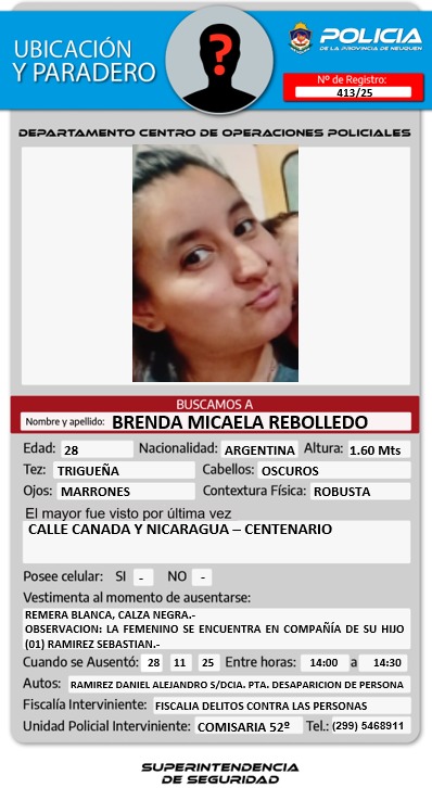 Una joven de 28 años de nombre Brenda Micaela Rebolledo y su hijo de tan solo un año, Sebastián Ramírez, se encuentran desaparecidos en Centenario. Una denuncia fue radicada el viernes 28 en la Comisaría N°52 luego de que no se supiera de su paradero en las últimas horas cuando fue vista en la zona de Canadá y Nicaragua.