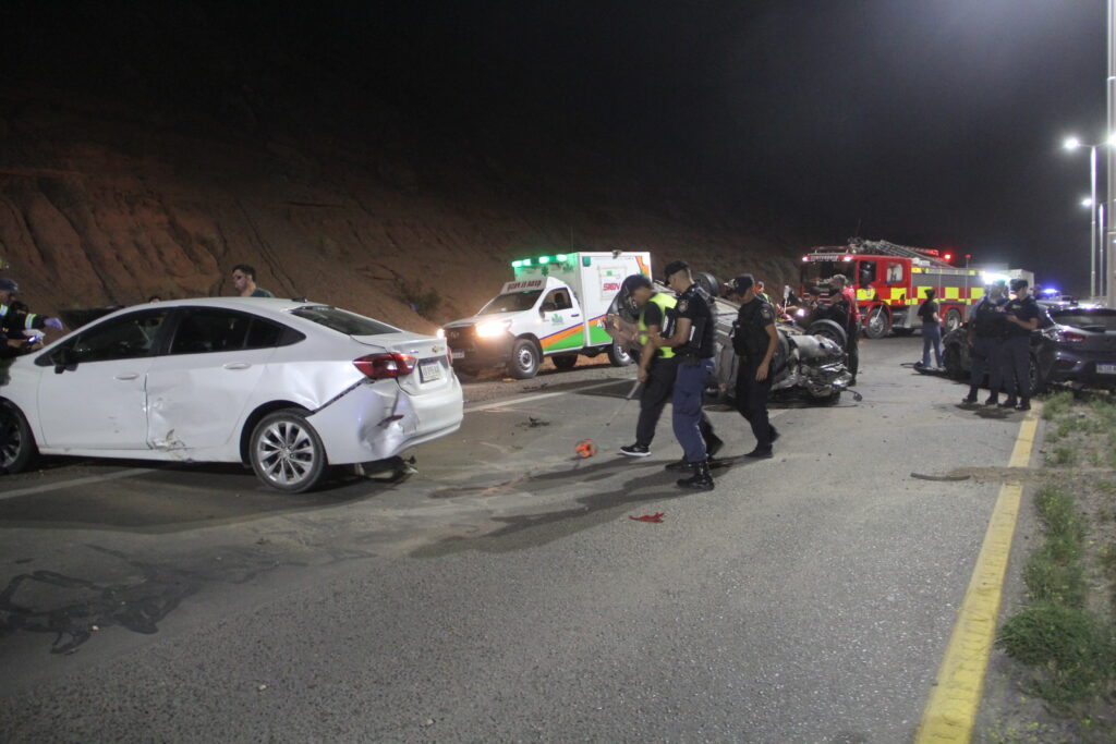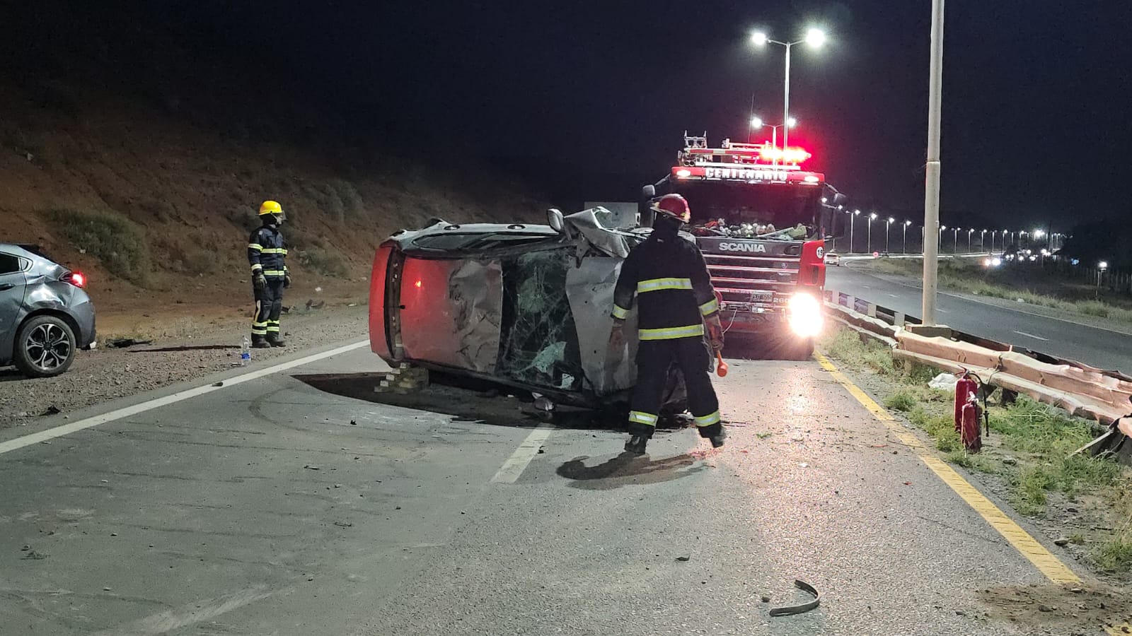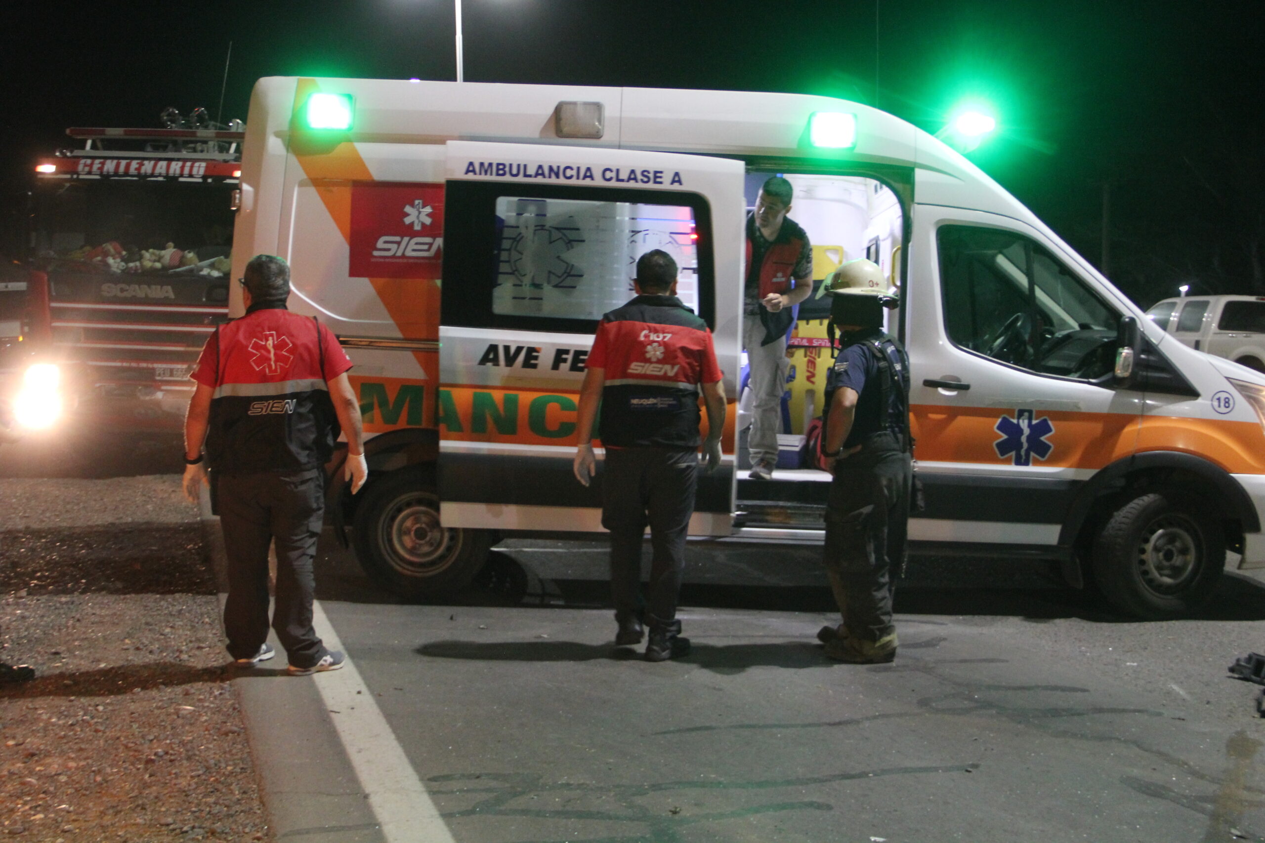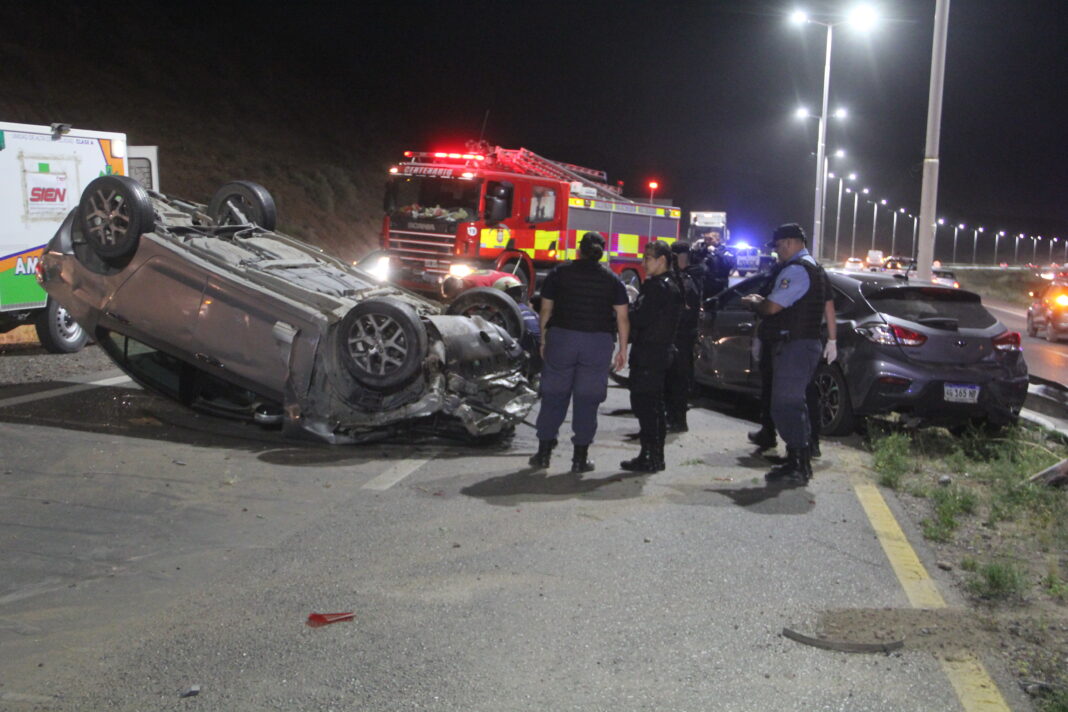 El tránsito tuvo que ser cortado y desviado por la calle colectora mientras policías realizaban las mediciones y bomberos procedían a dar vuelta el Honda el cual presentaba importantes daños materiales.