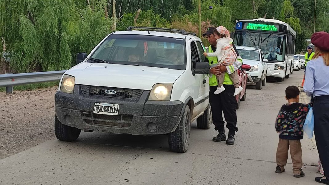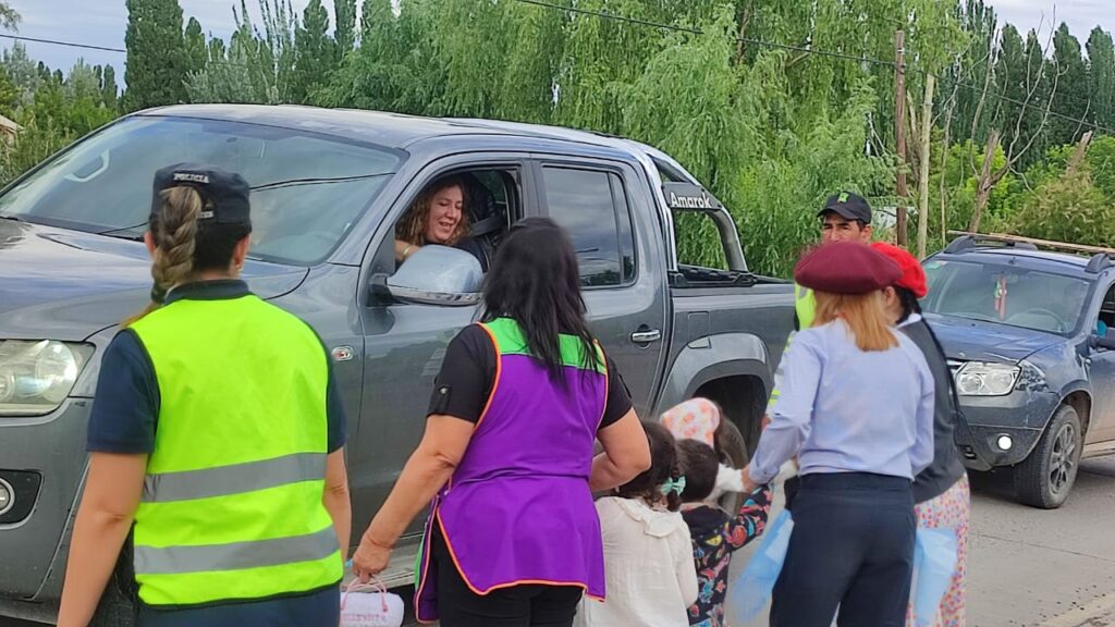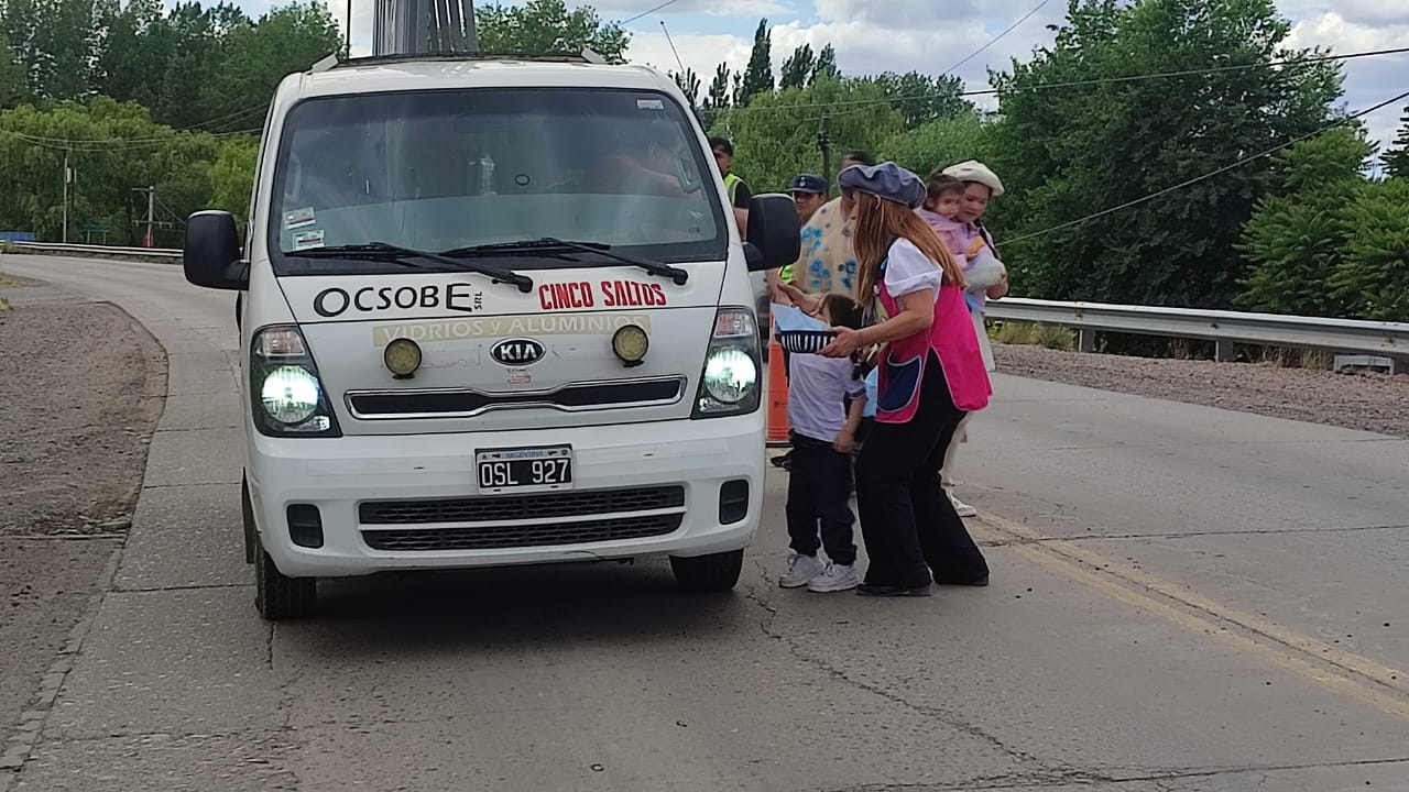 Efectivos policiales de Tránsito e inspectores municipales acompañaron la salida desde el edificio de la calle Fernando Rivas hasta la ruta interprovincial. El paso de cada vehículo fue con mucha alegría por parte de quienes lo conducían y recibían el presente de los niños con ropa gaucha.