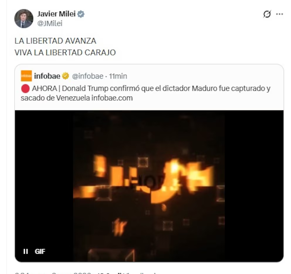 “La libertad Avanza. Viva la libertad carajo”, expresó Milei. La publicación del mandatario argentino fue luego de que Trump confirmara en su red Truth Socialque “Estados Unidos ha llevado a cabo con éxito un ataque a gran escala contra Venezuela y su líder,el presidente Nicolás Maduro, fue capturado y trasladado en avión junto con su esposa, fuera del país”. También se sumó Patricia Bullrich en X: “Venezuela será libre”.El tuit de Javier Milei