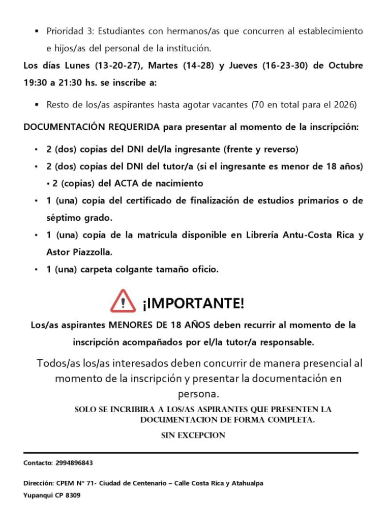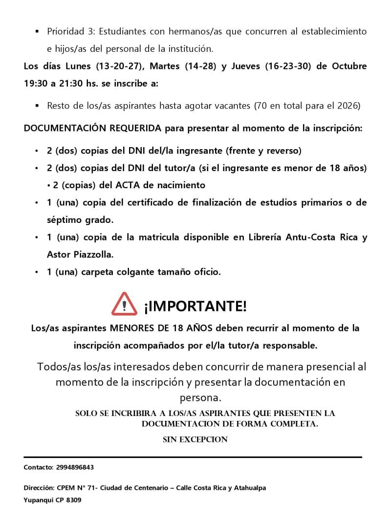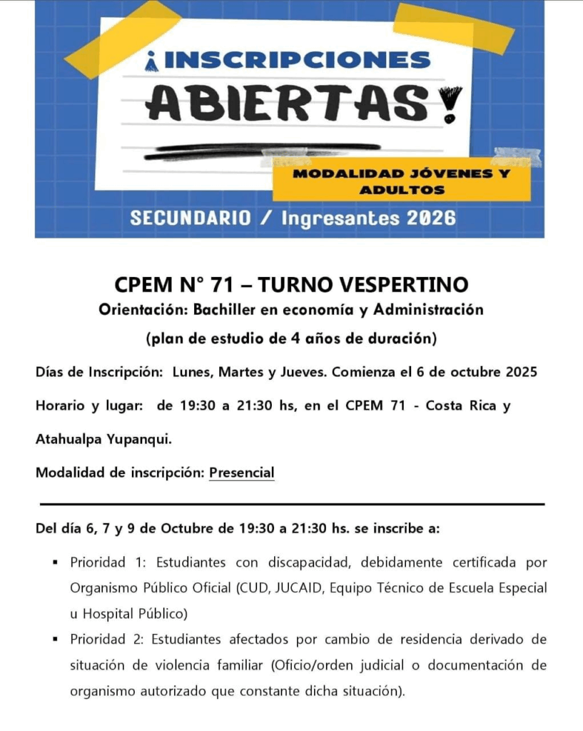 El CPEM N°71 de Centenario ya tiene desde el lunes 06 de octubre abiertas sus inscripciones para el turno vespertino del ciclo lectivo 2026. El plan de estudio es de cuatro años y el bachiller es con orientación en Administración y Economía, con la modalidad para jóvenes y adultos.