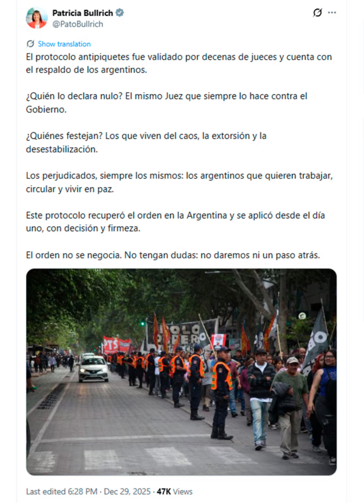 “Vamos a defenderlo a toda costa, porque es la herramienta que le devolvió orden y tranquilidad a los argentinos que quieren vivir en paz”, señaló la funcionaria en el posteo que luego replicó el presidente Javier Milei.