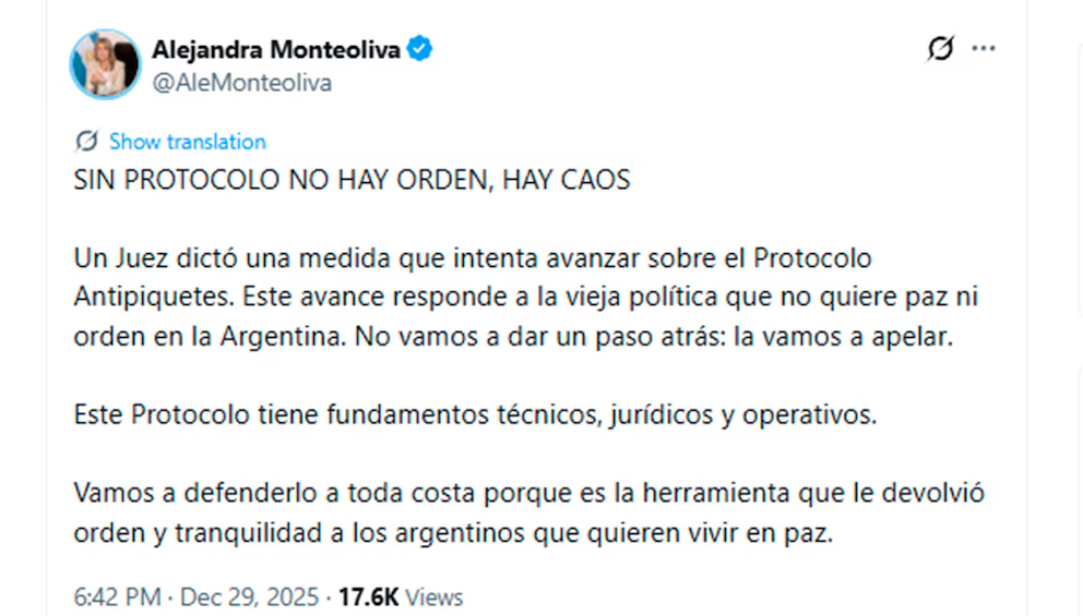 La propia Monteoliva se refirió al tema a través de un mensaje que compartió en su cuenta de X en el que consideró que “este avance responde a la vieja política que no quiere paz ni orden en la Argentina”.