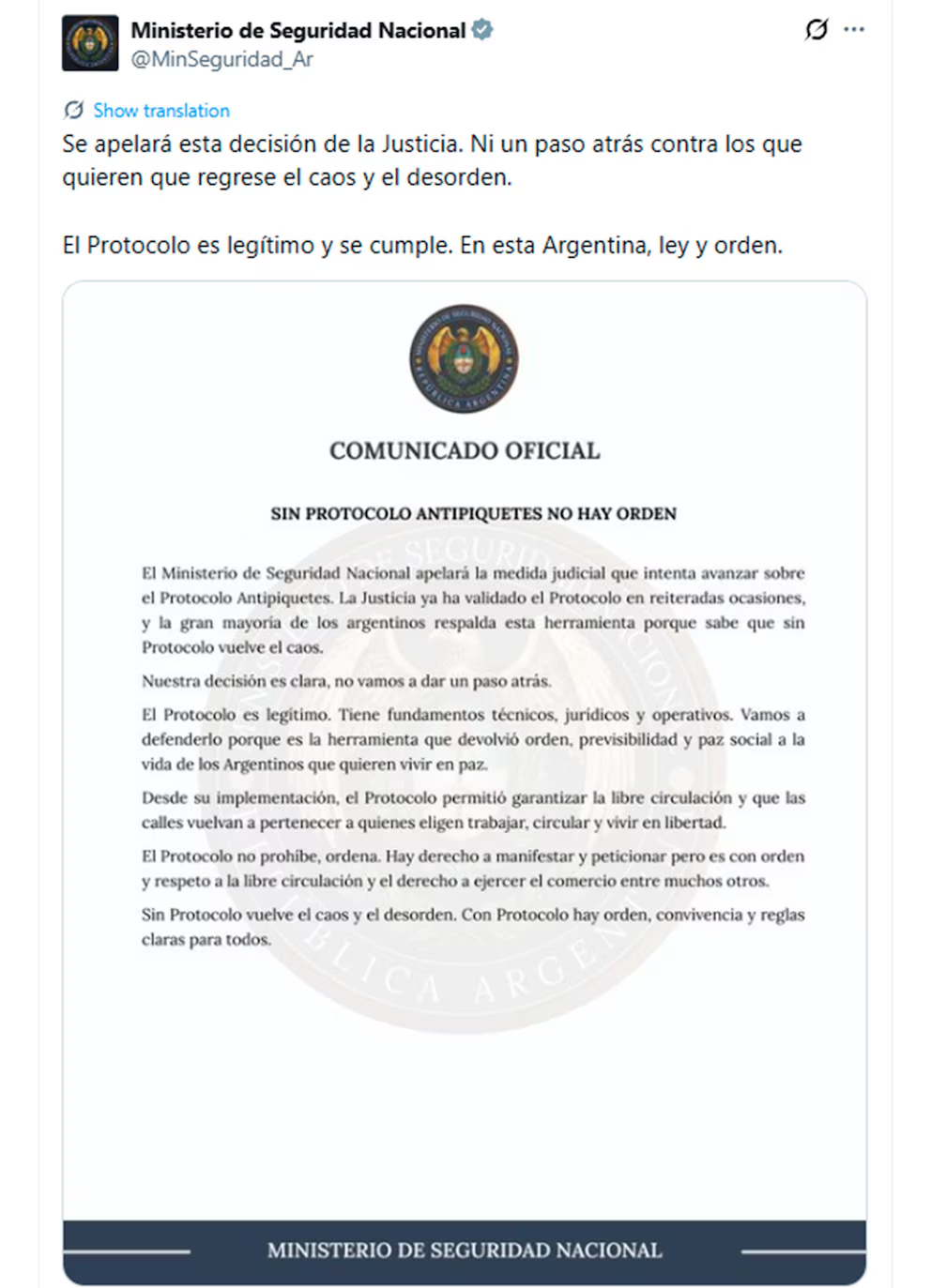“El 70% de los argentinos está a favor del protocolo. Esto es político. Se va a apelar. No vamos a dar un paso atrás. Vamos a ir contra esta medida que va en contra de los argentinos. Sin protocolo vuelve el desorden. Sin protocolo, no hay orden”, señalaron fuentes de la Casa Rosada En las últimas horas, Cormick hizo lugar a una acción de amparo y determinó que el procedimiento antipiquetes tiene vicios en su conformación legal, ya que -a su entender- en su creación el Poder Ejecutivo se atribuyó facultades que la Constitución reserva de manera exclusiva para el Legislativo.