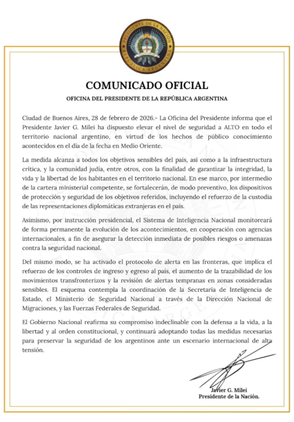 “La medida alcanza a todos los objetivos sensibles del pais, asi como a la infraestructura crítica, y la comunidad judia, entre otros, con la finalidad de garantizi la integridad, la vida y la libertad de los habitantes en el territorio nacional. En ese marco, por intermedio de la cartera ministerial competente, se fortalecerán, de modo preventivo, los dispositivos de protección y seguridad de los objetivos referidos, incluyendo el refuerzo de la custodia de las representaciones diplomáticas extranjeras en el país», informaron en un comunicado.