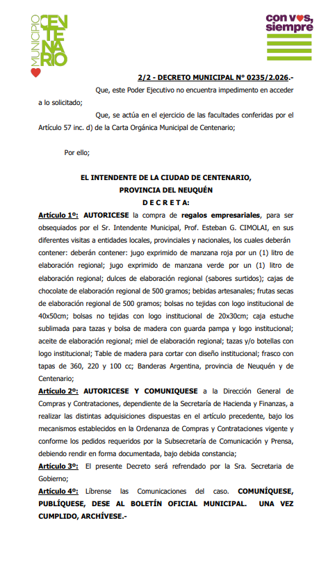 En una nota las Subsecretarías de Administración y Comunicación solicitaron autorización para la compra de regalos empresariales que serán obsequiados por el intendente Esteban Cimolai en sus visitas a entidades locales, provinciales y nacionales durante el año 2026.