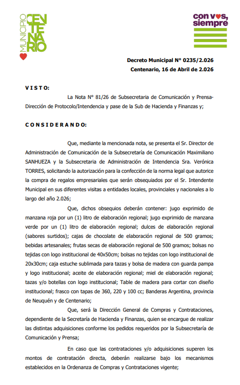 En tiempos donde las políticas del gobierno nacional son las de achicar gastos y lo mismo por parte de Provincia en lo que respecta a administraciones que sean más austeras y no destinen fondos por fuera de los necesarios para funcionar y brindar respuestas a la sociedad, en Centenario pareciera ser que esto no sucede por lo una compra autorizada por el municipio mediante el decreto N°0235 que se conoció en las últimas horas.