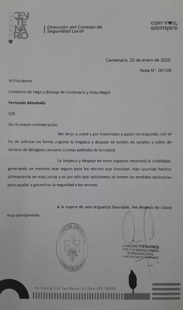 El municipio de Centenario le envío una nota al Consorcio de Riego y Drenaje en donde le solicita de forma urgente realice la limpieza y despeje de bordes de canales y calles de servicio de desagües cercanos a zonas pobladas de la ciudad.