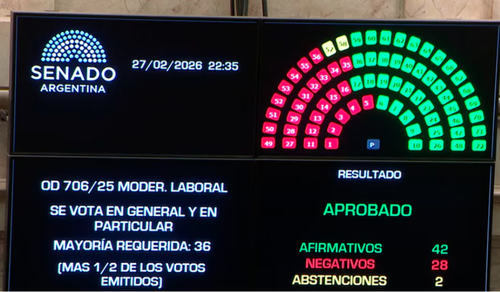 La Libertad Avanza (LLA) finalizó las sesiones extraordinarias este viernes en el Senado, con una consagración para el Gobierno de Javier Milei e inevitables consecuencias a medirse en el mediano plazo: la Cámara alta sancionó la ley de reforma laboral, tras la validación de la modificación al proyecto realizada la semana pasada por Diputados, que eliminó el conflictivo artículo sobre licencias médicas. Entre el oficialismo y dialoguistas como la Unión Cívica Radical (UCR), el PRO, peronistas disidentes y silvestres provinciales, la iniciativa obtuvo esta noche 42 votos a favor, mientras que 28 fueron en contra y se abstuvieron los santacruceños José María Carambia y Natalia Gadano, tras cuatro horas de debate.