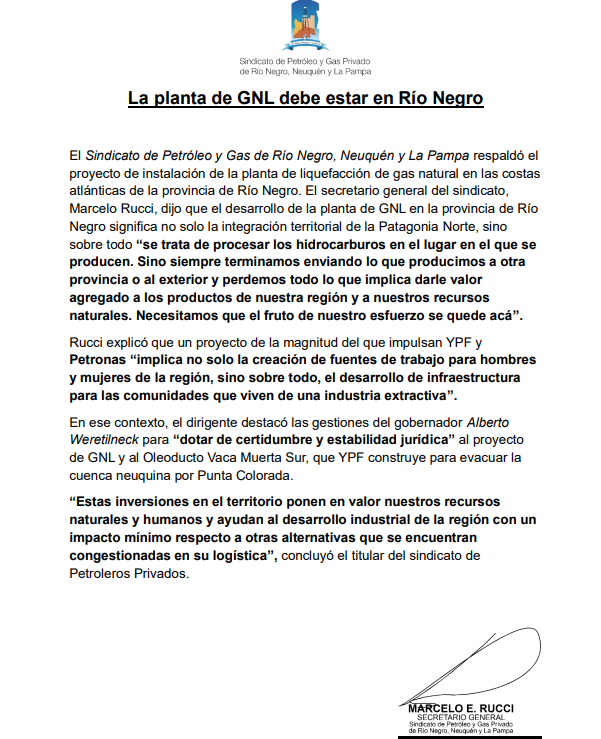 El Sindicato de Petróleo y Gas de Río Negro, Neuquén y La Pampa respaldó el proyecto de instalación de la planta de liquefacción de gas natural en las costas atlánticas de la provincia de Río Negro. El secretario general del sindicato, Marcelo Rucci, secretario general, dijo que el desarrollo de la planta de GNL en la provincia de Río Negro significa no solo la integración territorial de la Patagonia Norte, sino sobre todo “se trata de procesar los hidrocarburos en el lugar en el que se producen.