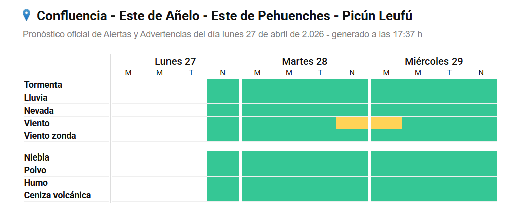 El Servicio Meteorológico Nacional emitió dos alertas amarillas por fuertes vientos para horas de la noche del martes 28 y la madrugada del miércoles 29 en las provincias de Neuquén y Río Negro. En la Confluencia los vientos constantes serán de entre 35 y 45 km/h soplando desde el oeste, algunas ráfagas pueden alcanzar los 87 kilómetros.