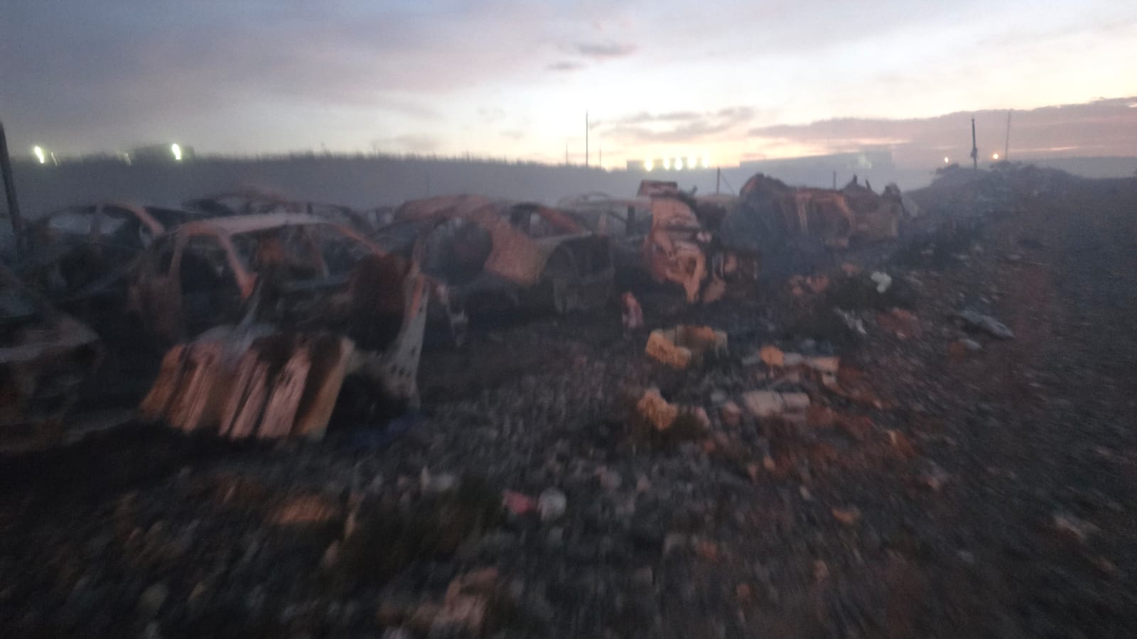 Un tota de 40 vehículos, entre autos y camionetas la mayoría aún sin desarmar por completo, fueron consumidos por el fuego. Bomberos intentaban hacerles frente a llamas de gran altura y una humareda que cubrió al menos cuatro cuadras del Parque Industrial, además hubo temor porque algunos de los vehículos tenían tubos de GNC.
