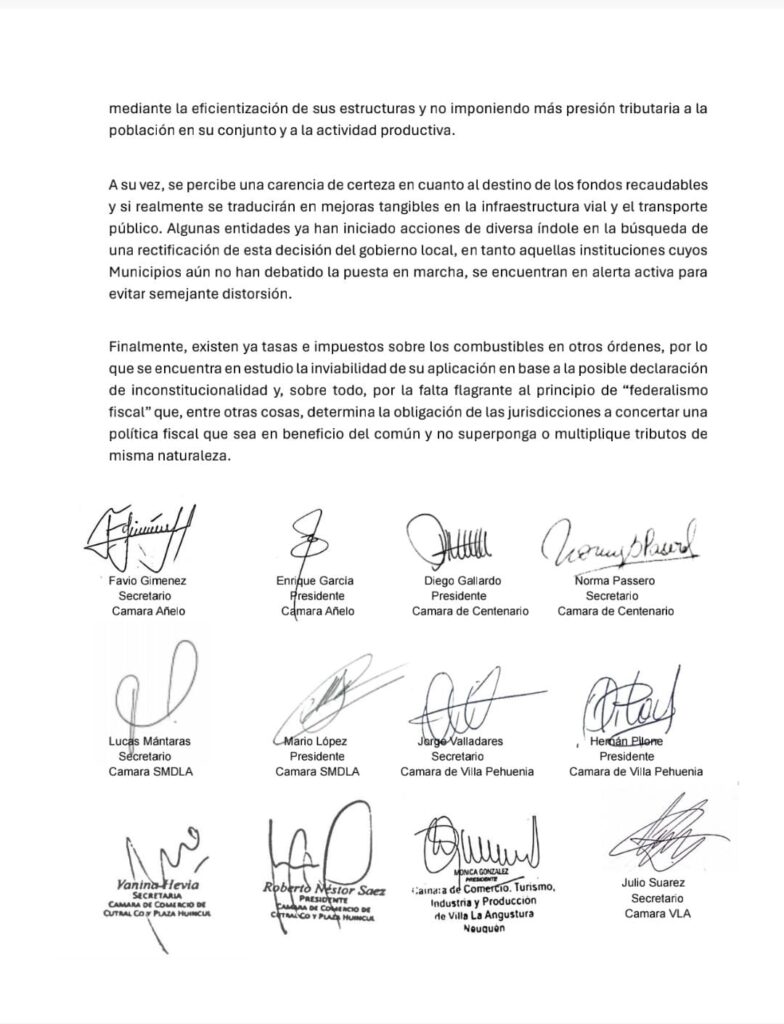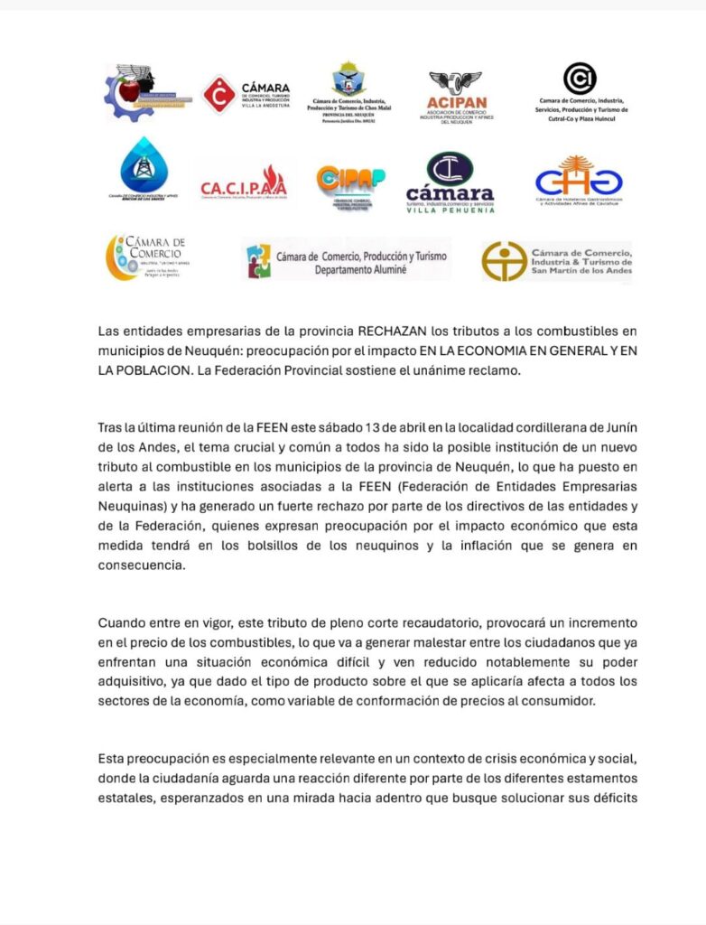 La Federación de Entidades Empresas Neuquinas (FEEN) y diferentes cámaras de comercio que la integran rechazó la aplicación de una tasa vial a los combustibles como fue aprobada en diferentes ciudades incluidas Centenario y Neuquén, pero que aún no se aplicó por falta de reglamentación.