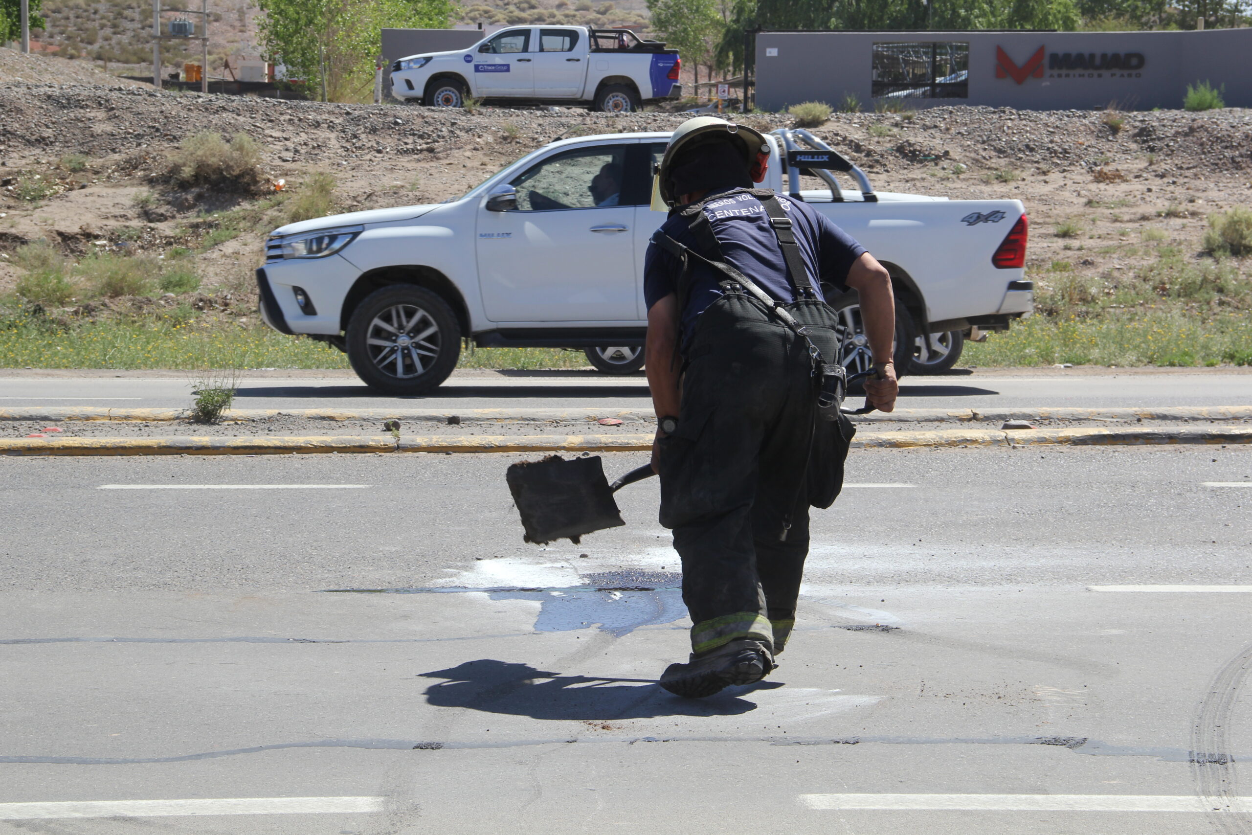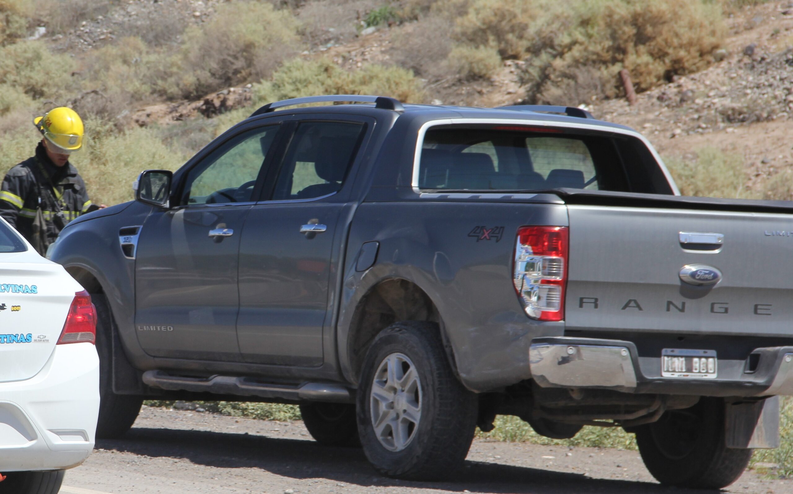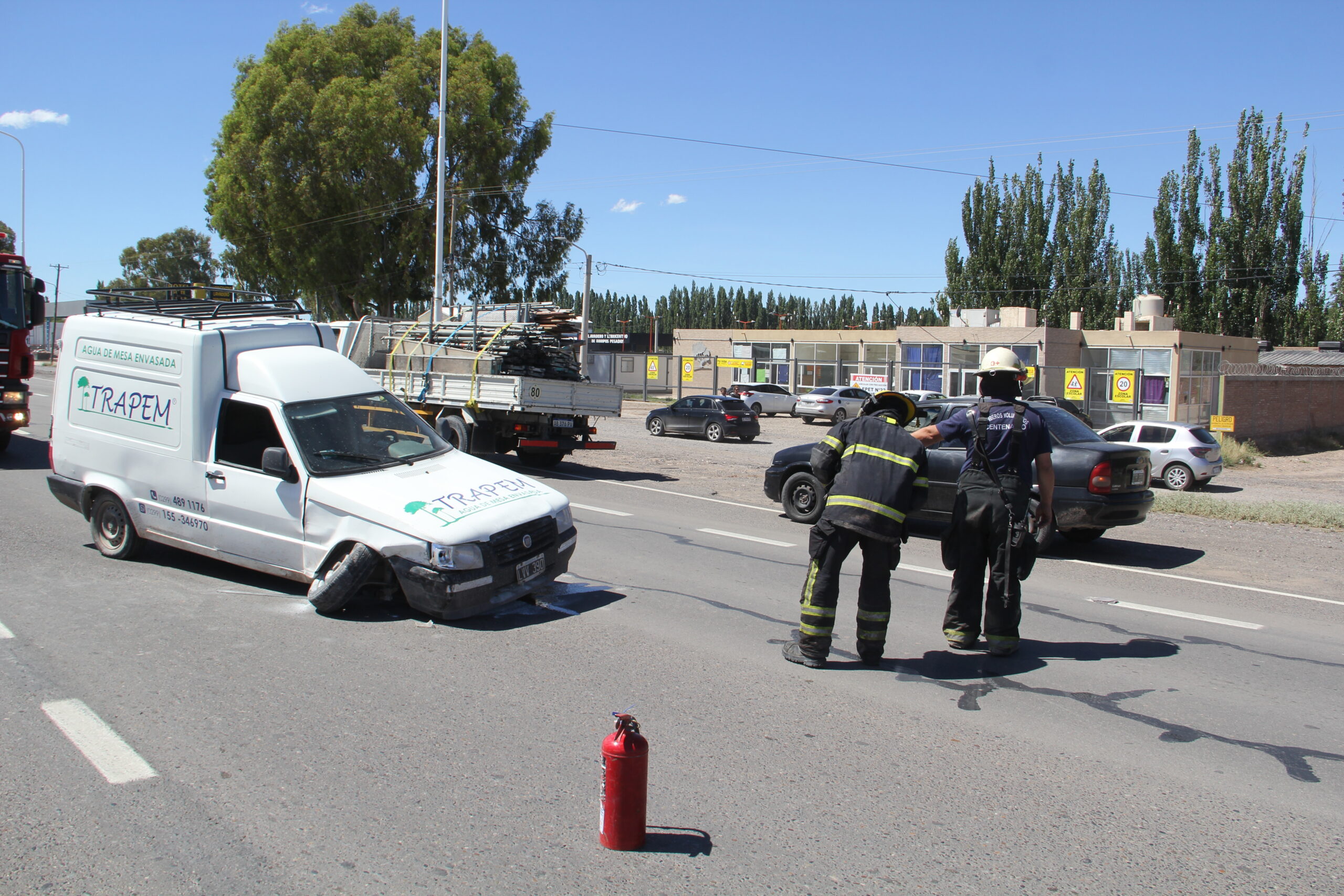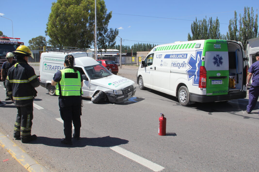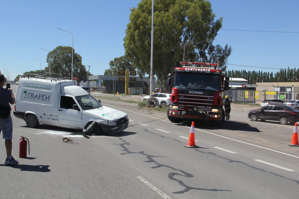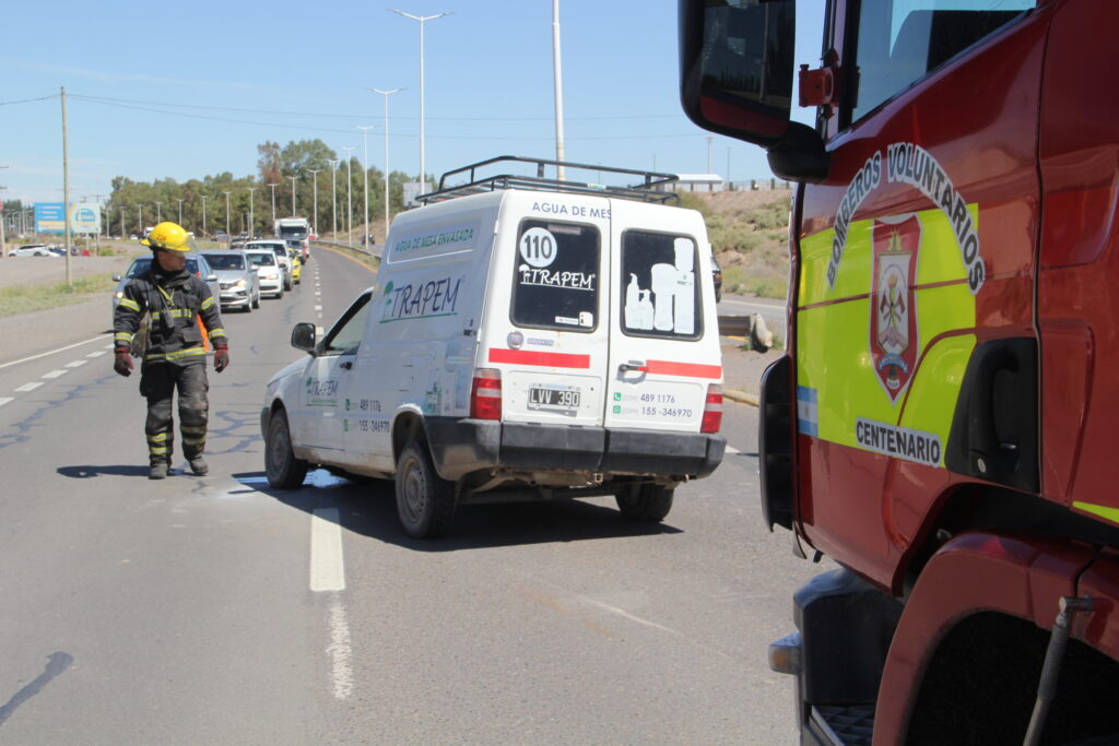 También sobre la mano Centenario-Neuquén circulaba una Fiat Fiorino de la cooperativa de agua envasada Trapem con dos trabajadores de 38 y 26 años a bordo, por motivos que se tratan de determinar esta impacta en el lateral derecho a la otra camioneta y con una de las ruedas delanteras semidesprendida derrapa y se cruza hacia la otra mano.