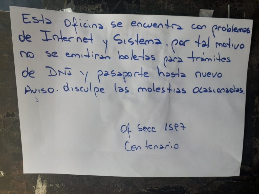 En Centenario la oficial público a cargo de la oficina 1597, Graciela Molina, comentó en diálogo con la FM Red Social 97.9 “Esperamos que se solucione pronto por la cantidad de gente que viene todos los días a hace su trámite y no lo podemos culminar, también hemos tenido problemas en internet que es otro tema por lo cual no hemos podido entregar actas”.