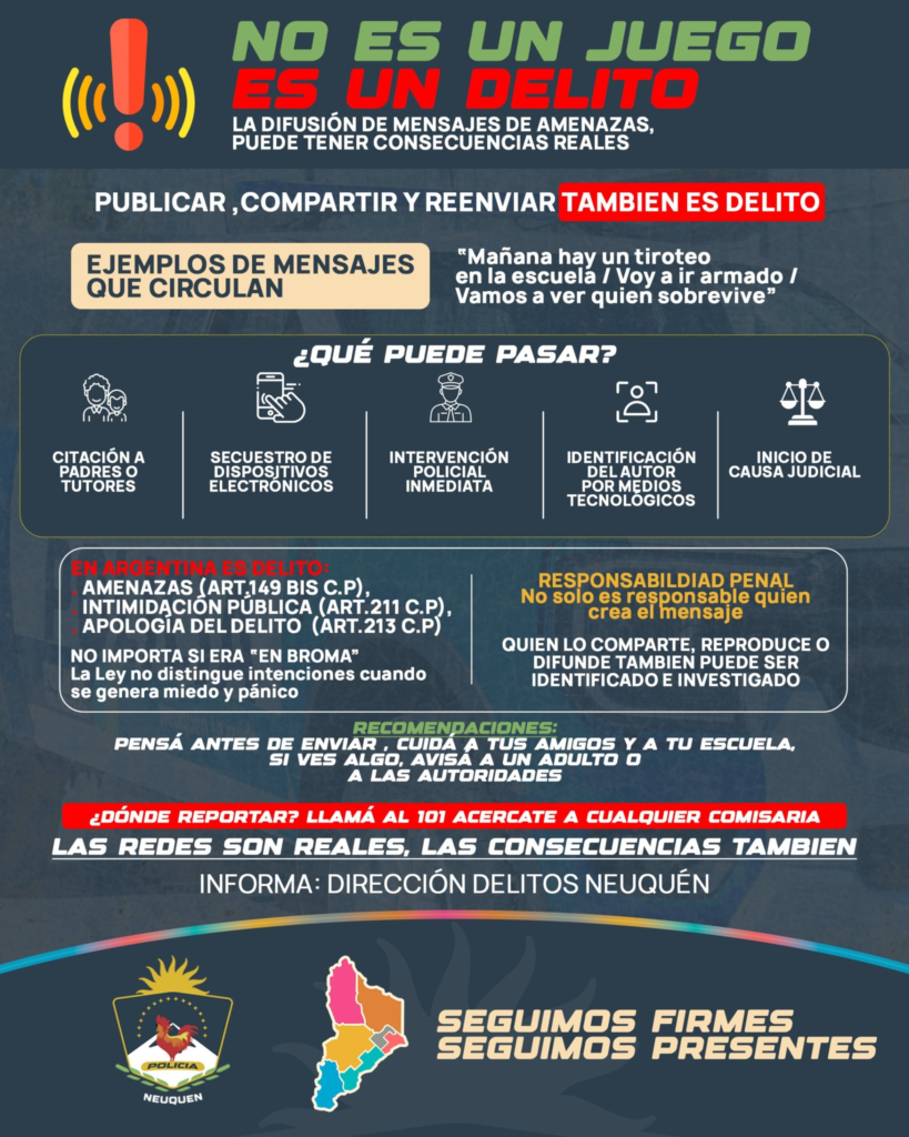 Ante la reiteración de estos casos, desde la Policía del Neuquén dieron a conocer mediante un video e imágenes diferentes informaciones relacionadas a esto que representa un delito y es investigado. Informaron que difundir mensajes de amenazas puede tener consecuencias reales “No es un juego, es un delito”.