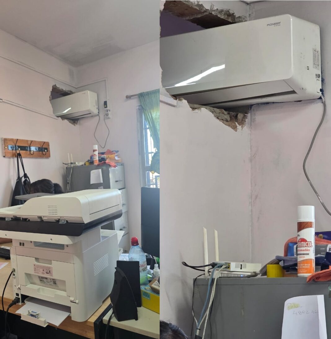 No es un meme que circula en las redes sociales, la imagen es real y de Centenario. Una pared rota y la mitad de un aire acondicionado que asoma en una oficina.