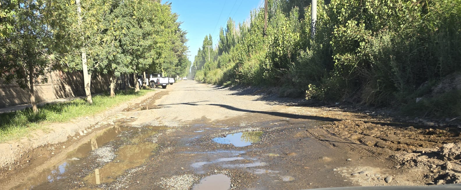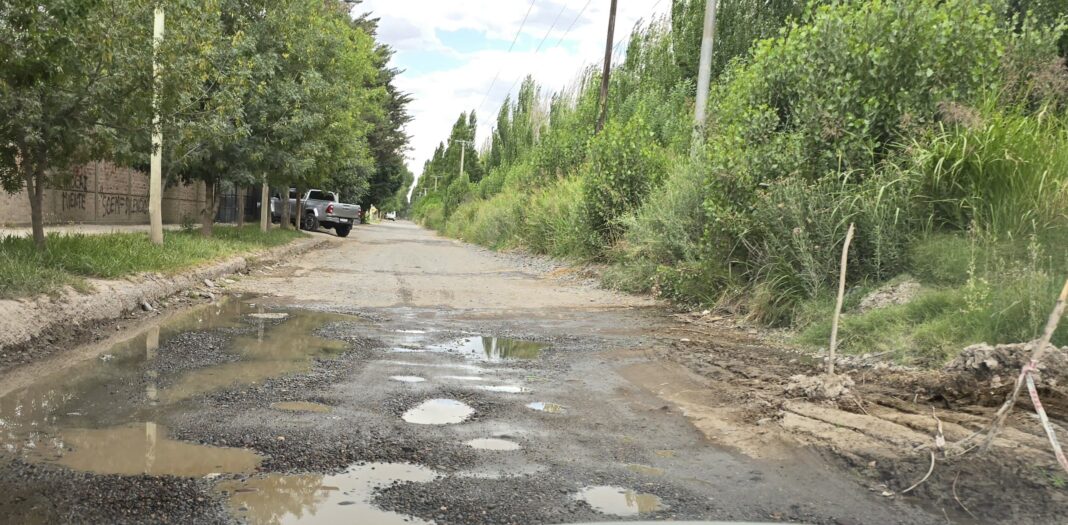 Pero las complicaciones comenzaron como sucede hace años con filtraciones y desbordes del canal de riego lo que provoca anegamientos y que la calle esté poceada. Es imposible ya transitar por el lugar porque en los pozos ya entra un neumático.