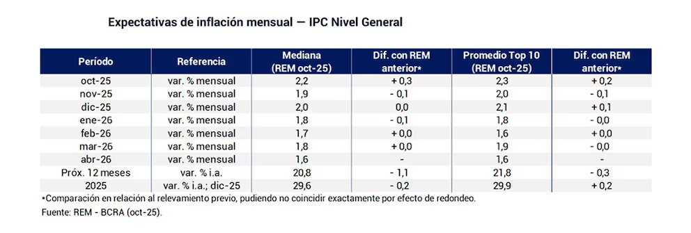 En relación a las proyecciones de los próximos meses, los principales analistas del mercado estiman que el IPC será de 1,9% en noviembre, de 2% en diciembre y de 1,8% en enero de 2026. Esperan que 2025 cierre con un nivel general de precios del 29,6%.
