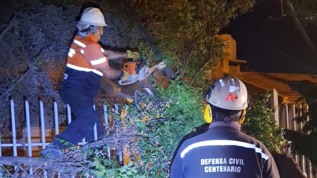 El temporal de viento en Centenario dejó diferentes complicaciones que comenzaron el sábado por la tarde y continuaron hasta la mañana del domingo 16. Defensa Civil tuvo más de 20 intervenciones, trece en total fueron por caída de árboles, cuatro por cables sobre la vía pública y cinco por postes con riesgo de caída, además de otras 4 por cableado de internet o telefonía.