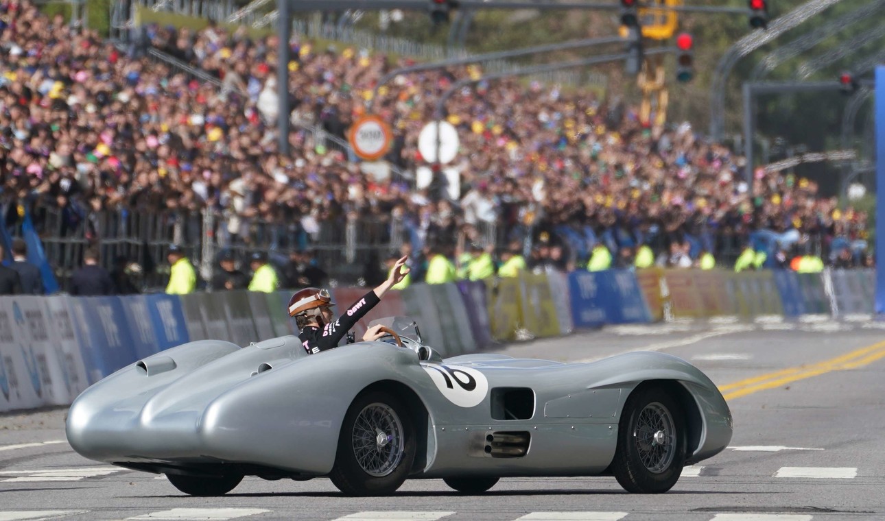 El argentino se sube a una réplica del Mercedes-Benz W196, reconocido por ser el auto con el que Juan Manuel Fangio, pentacampeón del mundo de la Fórmula 1, ganó el título en 1954.