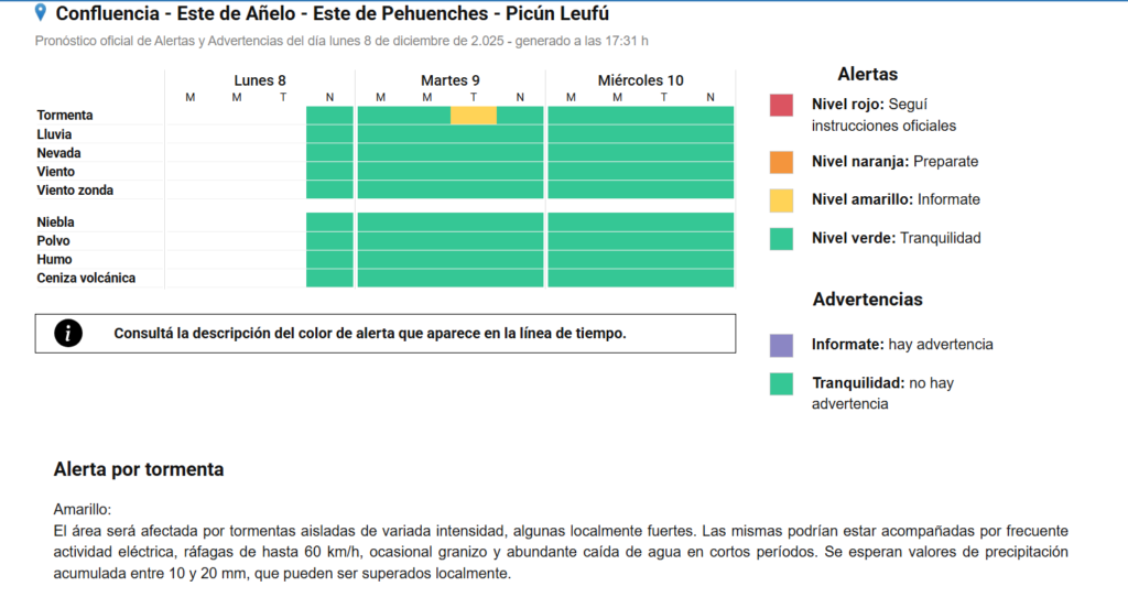 Una alerta amarilla fue emitida para horas de la tarde para el Departamento Confluencia, Picún Leufú y el este de Añelo y Pehuenches. Según el Servicio Meteorológico Nacional, el área podría ser afectada por tormentas aisladas de variada intensidad, algunas localmente fuertes, podrían estar acompañadas de actividad eléctrica, vientos de hasta 60 km/h, ocasional granizo y abundante caída de agua con acumulados de hasta 20 mm o más.