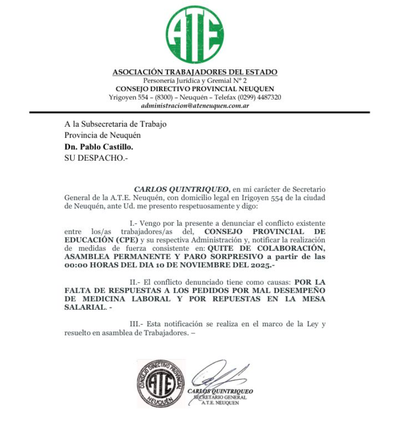 El conflicto según indicaron ante la Subsecretaría de Trabajo de Neuquén en una nota firmada por el secretario general Carlos Quintriqueo, es por la falta de respuestas a los pedidos por mal desempeño de medicinal laboral y en la mesa salarial.