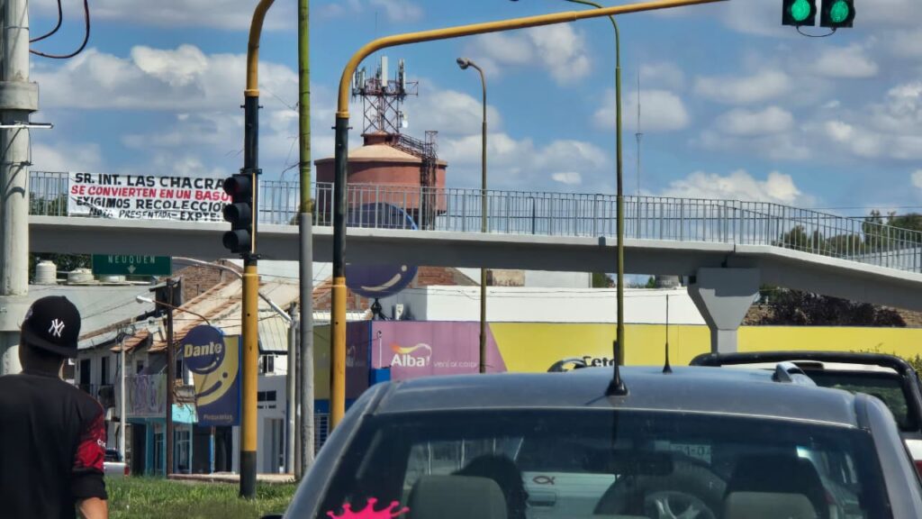 En la segunda rotonda de Centenario dos coloridos pasacalles se pueden observar desde el domingo 09 sobre las barandas de la pasarela que atraviesa la Ruta 7 y llevan un mensaje directamente dirigido al intendente Esteban Cimolai porque que las chacras se convierten en un basural según menciona el texto.