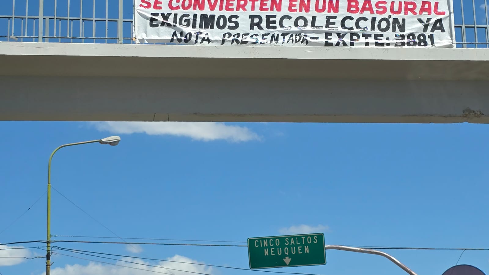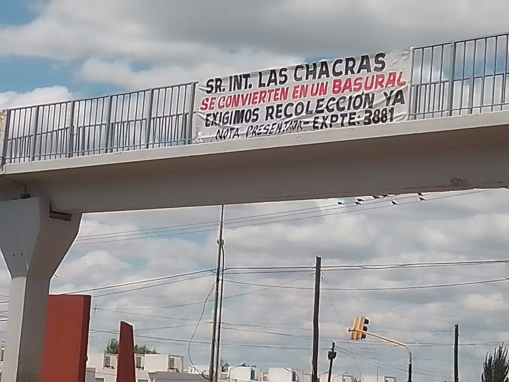 En la segunda rotonda de Centenario dos coloridos pasacalles se pueden observar desde el domingo 09 sobre las barandas de la pasarela que atraviesa la Ruta 7 y llevan un mensaje directamente dirigido al intendente Esteban Cimolai porque que las chacras se convierten en un basural según menciona el texto.