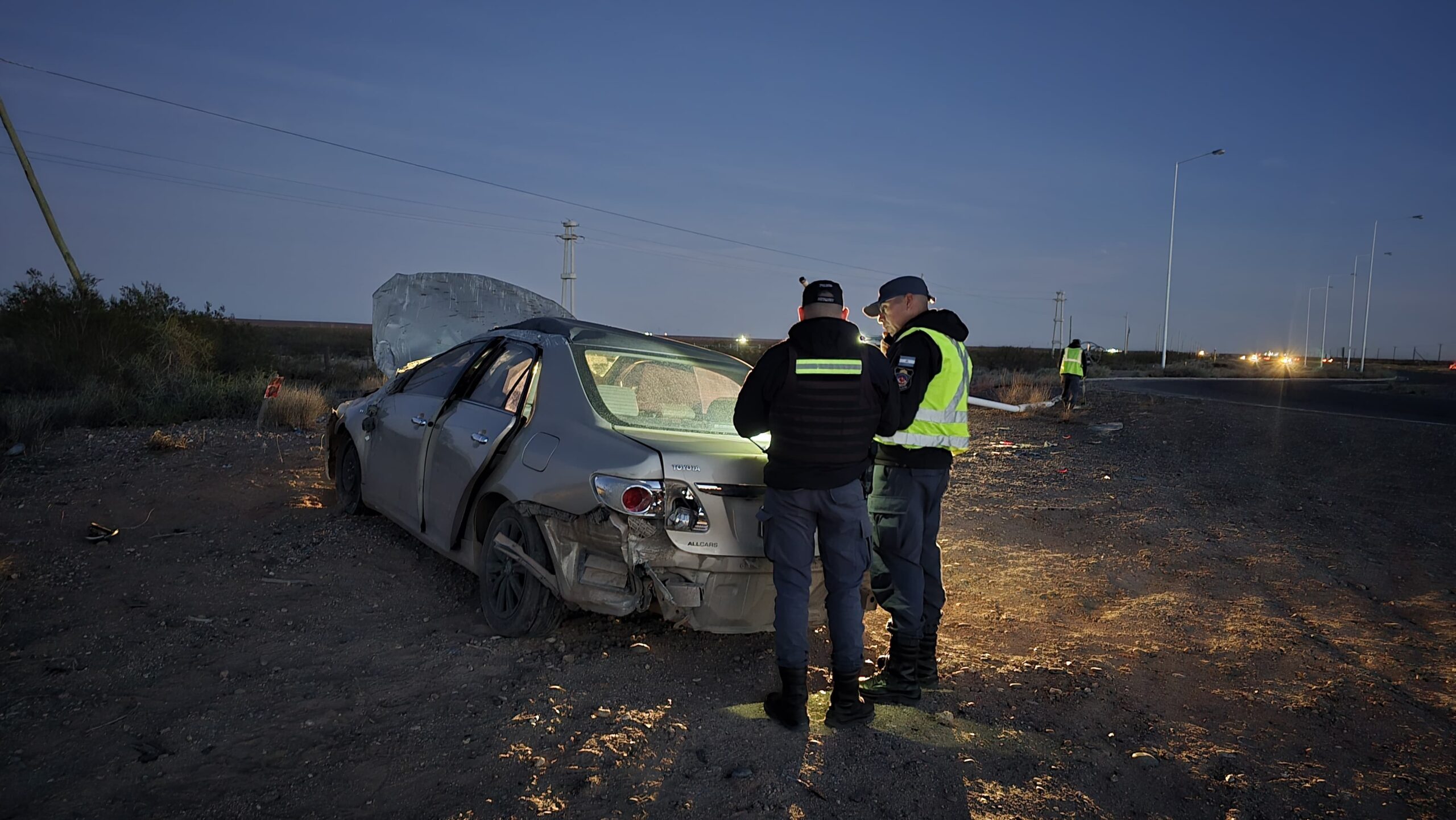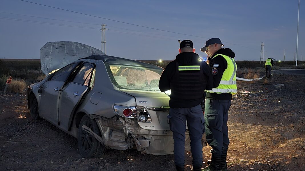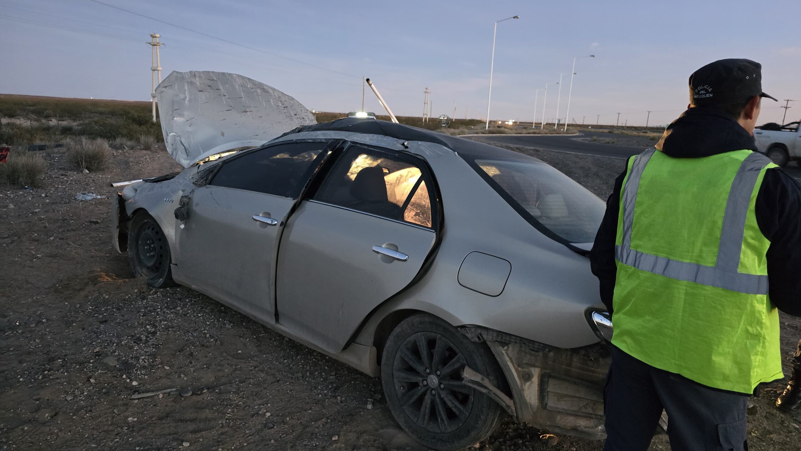 Un auto Toyota Corolla volcó en la segunda rotonda de la Ruta N°51, zona de TGS, minutos antes de las 6:30 de la mañana del domingo 27. Una mujer de unos 32 años que lo conducía pudo salir por sus propios medios y se retiró del lugar junto a su pareja quien al parecer la acompañó a un centro asistencial.