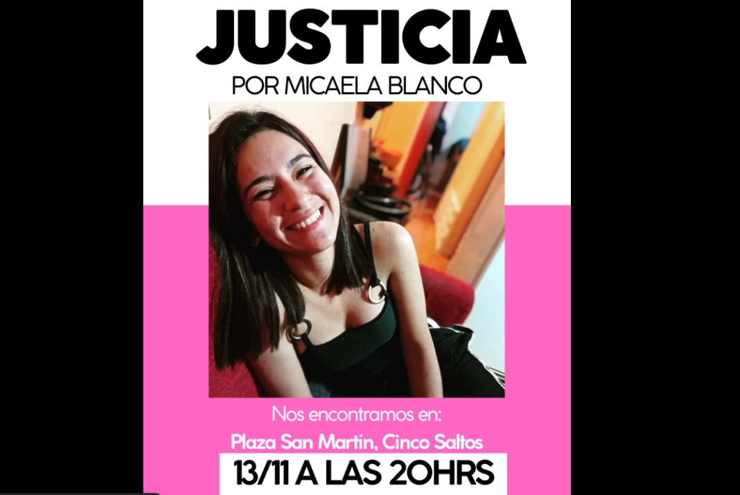El miércoles 13 a las 20 hs. en la Plaza céntrica San Martín de Cinco Saltos amigos y compañeros de trabajo de Micaela Blanco, la joven ciclista de 27 años que murió tras ser atropellada en su bicicleta por un conductor alcoholizado y que la dejó abandonada, se concentrarán para pedir justicia.
