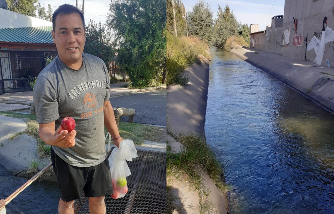 El canal principal de riego y las manzanas y peras que terminan adentro del mismo puede ser algo habitual para vecinos de Centenario y ciudades valletanas acostumbrados tal vez a esa postal, pero no para quienes por primera vez lo observan. Esto le pasó a Adan Neira, un joven de Buenos Aires que hace ya un año llegó a nuestra ciudad con su familia.