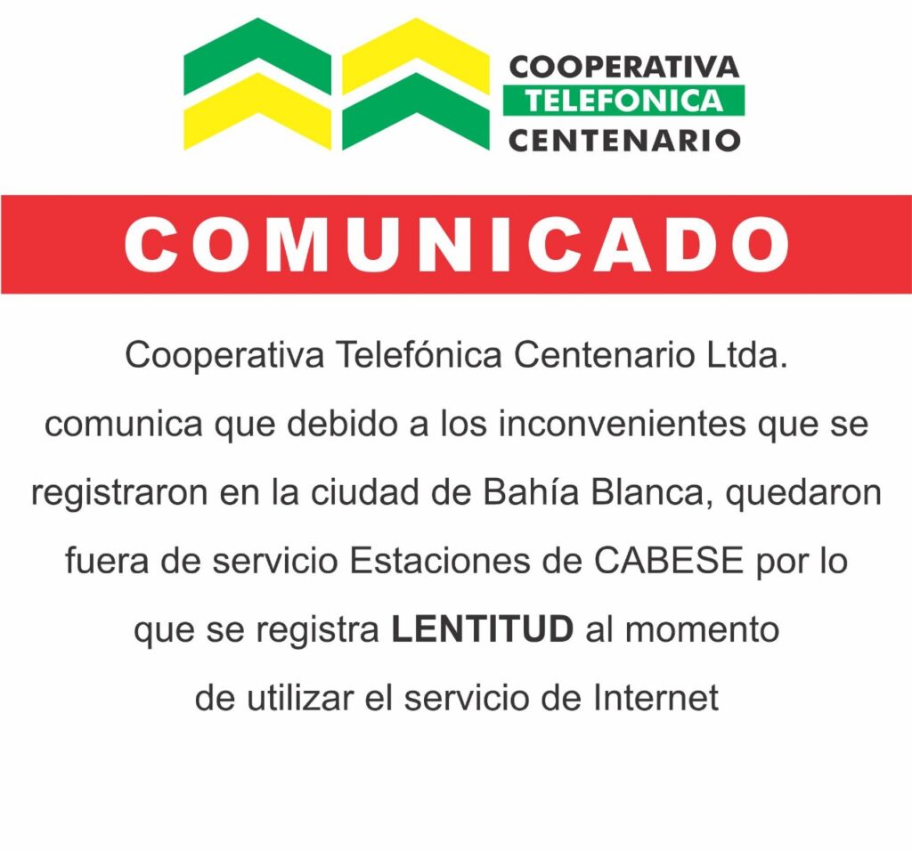La Cooperativa Telefónica Centenario mediante un comunicado informo que debido a que están fuera de servicio las estaciones de CABESE, el sistema a nivel local registra lentitud.