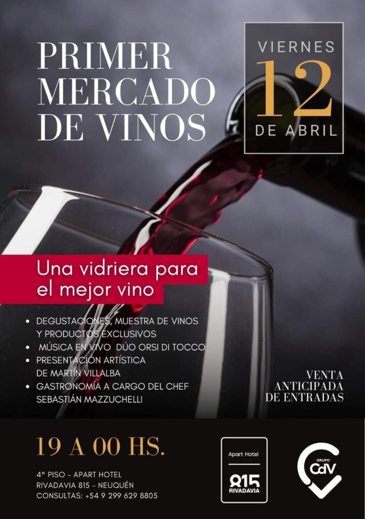 Este viernes 12 de abril de 19 a 00 hs. en Apart Hotel Rivadavia 815, de Neuquén Capital, se realizará el Primer Mercado de Vinos, un evento que será una vidriera para el mejor vino de bodegas regionales y hasta de Mendoza que ofrecen sus mejores productos. Luciana Zanellato, gerenta del hotel capitalino, comentó durante una entrevista con la FM Red Social 97.9: “Se va a desarrollar en el cuarto piso y la propuesta es que quienes asistan puedan acceder a un contacto directo con ciertas bodegas que nos acompañan, asesorarse, acceder a un contacto directo con etiquetas que no están en lugares convencionales, en su mayoría son regionales porque son lugares que tienen muchas propuestas”.
