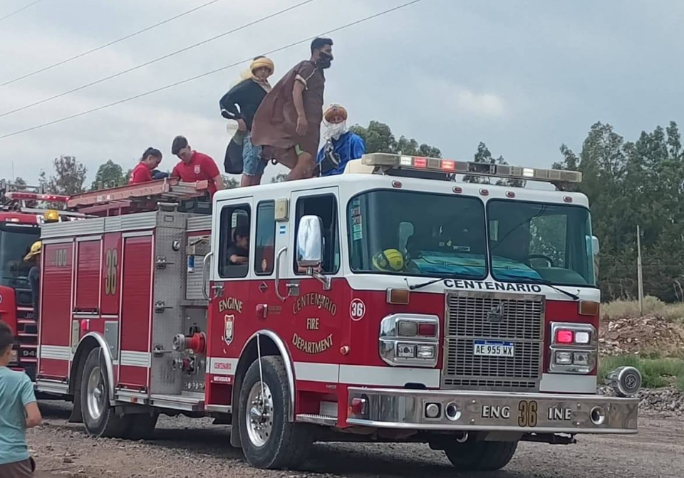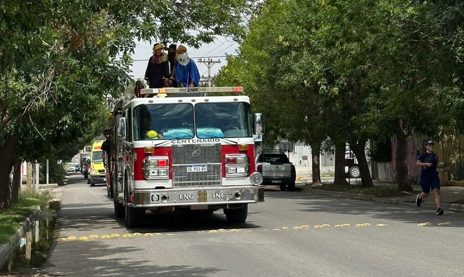 El martes 06 por la mañana los bomberos voluntarios de Centenario acompañaron a los Reyes Magos a recorrer la ciudad y llevarle un presente a los niños. Desde las 10 partieron del cuartel de la calle Yupanqui y comenzaron con su visita a las diferentes plazas.