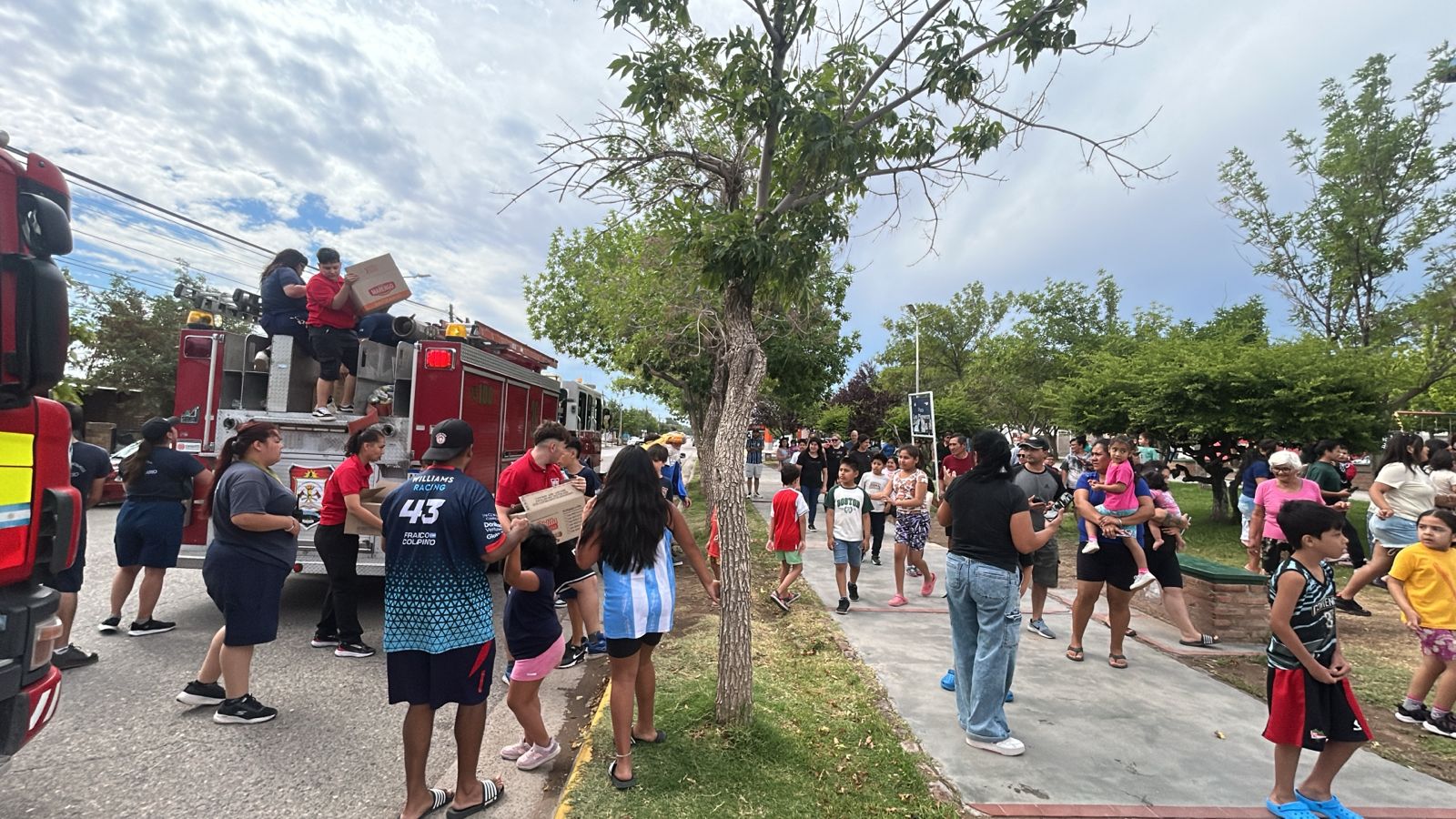 Las familias se acercaban y había un presente, una bolsita con golosinas y un escudo adhesivo de la institución bomberil, en total repartieron más de 4 mil. Debieron modificar parte de la caravana porque varias calles de la segunda meseta estaban con mucho barro producto de la lluvia caída horas antes.