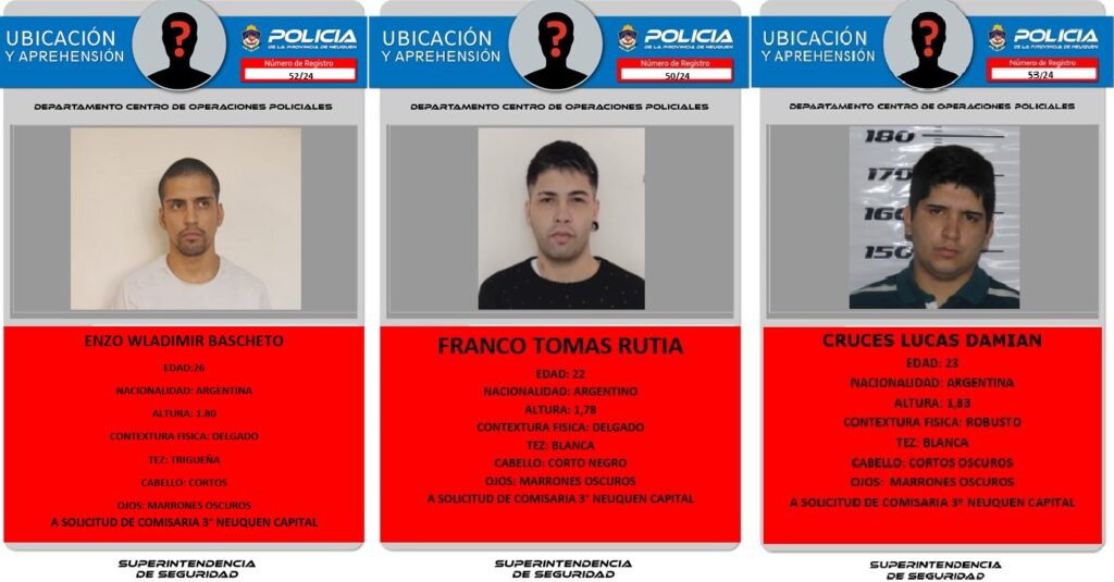 Los fugados son Jorge Marcelo Loyola Sosa, de 53 años, Castro Riquelme “Jimi Hendrix” de 25 años y nacionalidad chilena, Franco Tomás Rutia, de 22 años, Enzo Wladimir Bascheto, de 26 años y Cruces Lucas Damián, de 23 años. Sosa es uno de los asesinos del agenciero Miguel “Ruso” Auer.