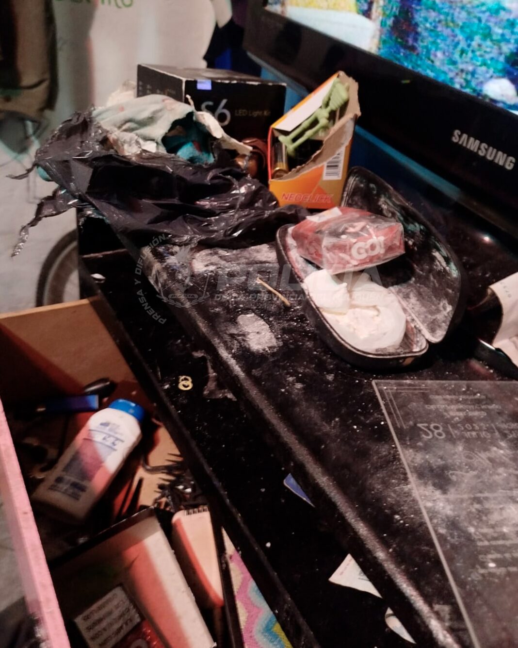 Durante las diligencias, además, se produjo el hallazgo de envoltorios con clorhidrato de cocaína, con un peso total de 26 gramos. Asimismo, se solicitó la presencia de personal del EPEN para proceder a la desconexión de una conexión eléctrica clandestina detectada en una de las propiedades allanadas.
