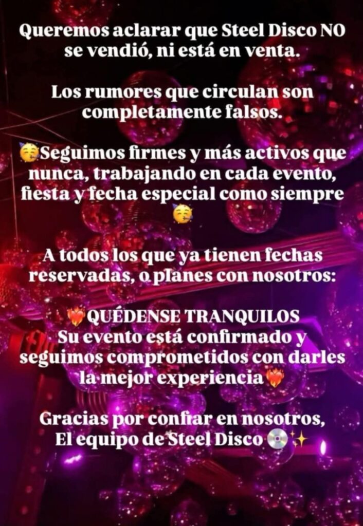 “Quédense tranquilos, su evento está confirmado y seguimos comprometidos con darles la mejor experiencia. Gracias por confiar en nosotros” comunicaron y agregaron que no tienen intención alguna de interrumpir la actividad. También indicaron que están atendiendo de lunes a viernes de 9 a 12 y de 16 a 19, ante cualquier duda el teléfono para consultas es el 4891696.